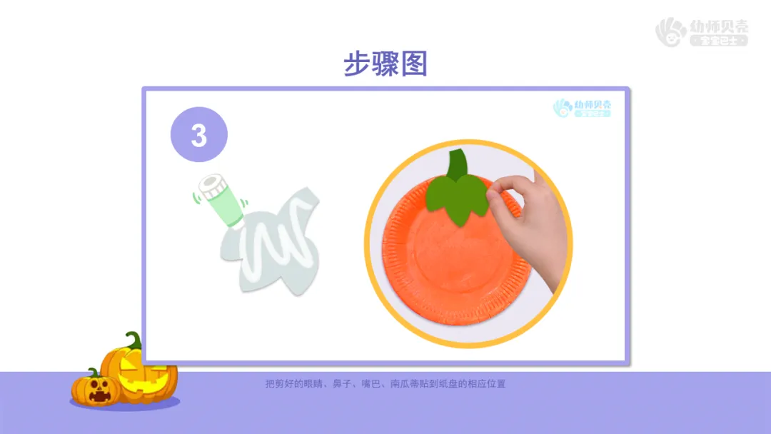 3)把剪好的眼睛、鼻子、嘴巴、南瓜蔓贴到纸盘的相应位置。
