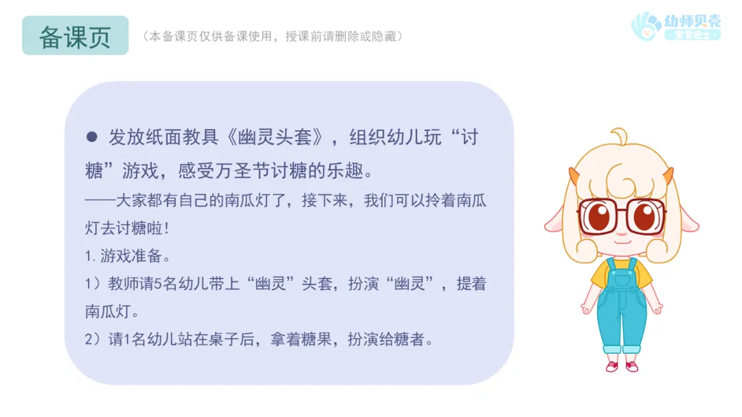 l发放纸面教具《幽灵头套》,组织幼儿玩“讨糖”游戏,感受万圣节讨糖的乐趣。