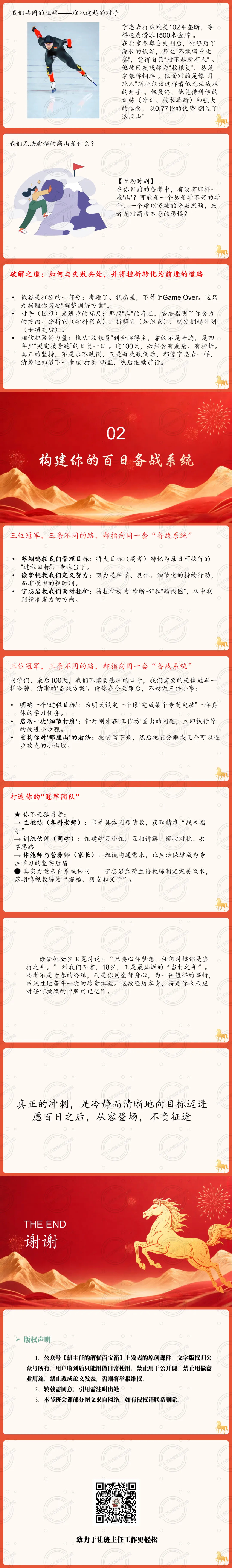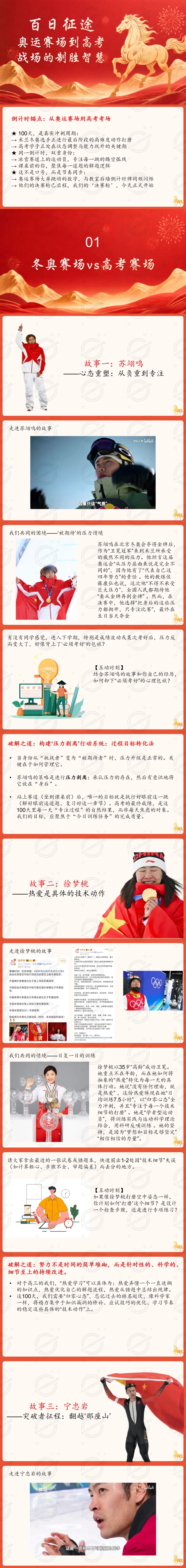 本次班会课以高考百日冲刺为核心背景,将米兰冬奥赛场的冠军制胜智慧与高考备考相联结,打造一场兼具励志性与实操性的冲刺动员课,旨在为高三学子拆解百日备战的核心逻辑,从心态、行动、抗挫力三个维度提供可落地的备考方法,帮助学生在最后100天调整状态、明晰方向,以冠军的思维和行动迎接高考挑战。