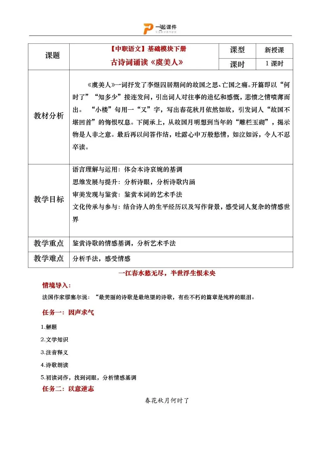 【中职语文基础模块下】| 《虞美人》:课件+教学设计