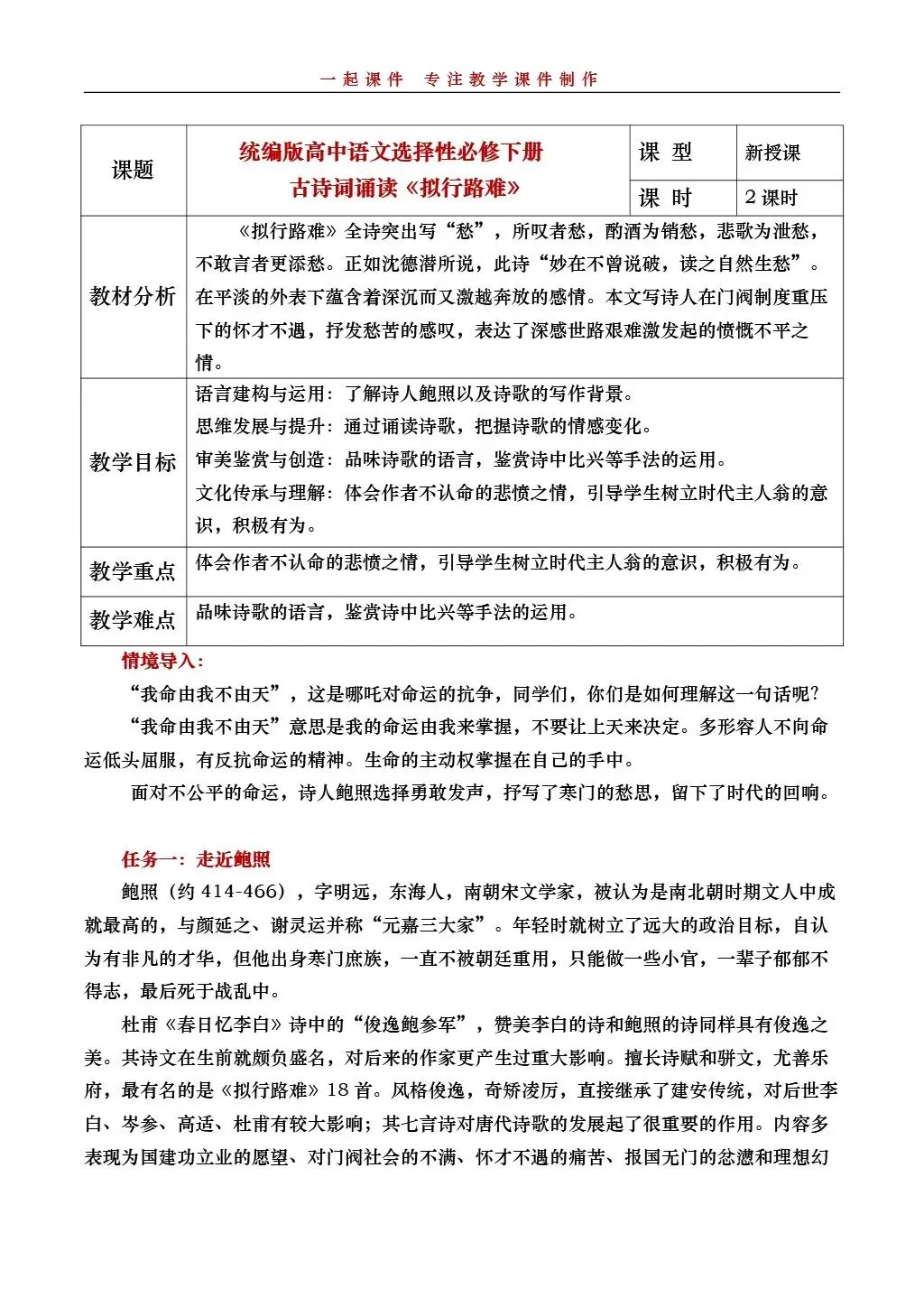 >【一起语文选必下】| 《拟行路难》:课件+教学设计