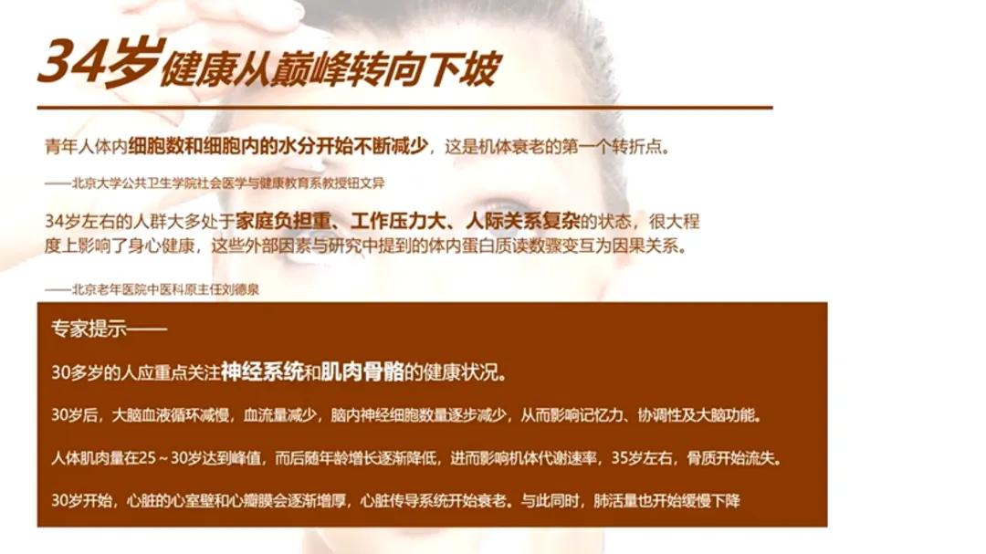 34岁,是很多人事业上的黄金期,却是身体从巅峰走向下坡的转折点。你会发现,熬一次夜,好几天都缓不过来;脸上的胶原蛋白,好像一夜之间就离家出走了。
