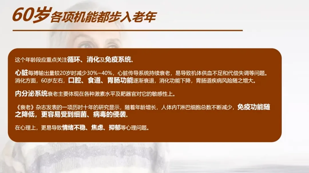 到了60岁,身体机能进入一个全面的衰减期。我们的心脏输出量,比20岁时减少了30%到40%。以前一口气上五楼不费劲,现在爬两层楼可能就要喘口气。我们的免疫系统也大幅降级,T淋巴细胞的减少,让身体更容易受到感染,患癌风险也开始增加。同时,消化系统变弱,各种慢性病开始找上门来。
