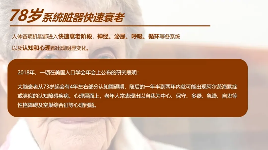 78岁左右,全身的脏器,尤其是神经系统、泌尿系统和呼吸循环系统,进入了快速衰退通道。最令人担忧的是认知障碍的风险显著增加,也就是我们常说的阿尔茨海默病。这个阶段,除了身体上的照顾,老人的心理慰藉变得前所未有的重要。