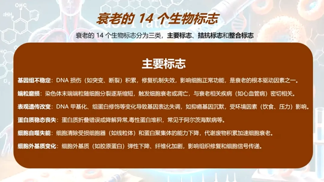 衰老的本质,不是单一器官的磨损,而是由基因主导的、全身细胞的系统性紊乱。为了更清晰地理解这个过程,科学家们总结了衰老的14个生物标志物,它们可以分为三类: