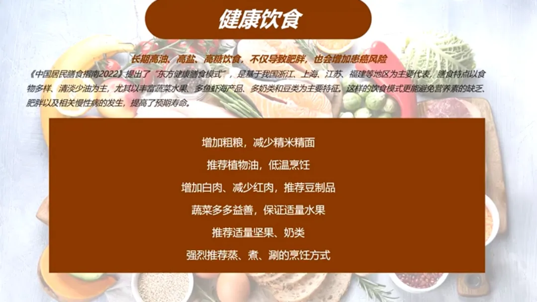 1、健康饮食: 增加粗粮,减少精米白面;多用植物油低温烹饪;多吃白肉、豆制品和蔬菜水果。推荐蒸、煮、涮的烹饪方式。
