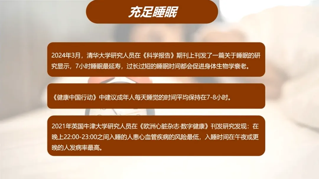 2、充足睡眠: 清华2024年研究显示,7小时是最佳睡眠时长。尽量在晚上10-11点入睡,这对降低心血管疾病风险至关重要。