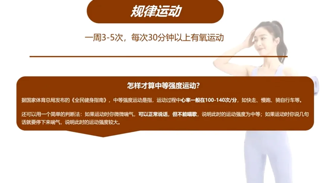 3、规律运动: 每周3-5次,每次30分钟的中等强度有氧运动,心率保持在100-140之间,运动时能说话但不能唱歌,这就是最适合普通人的强度。