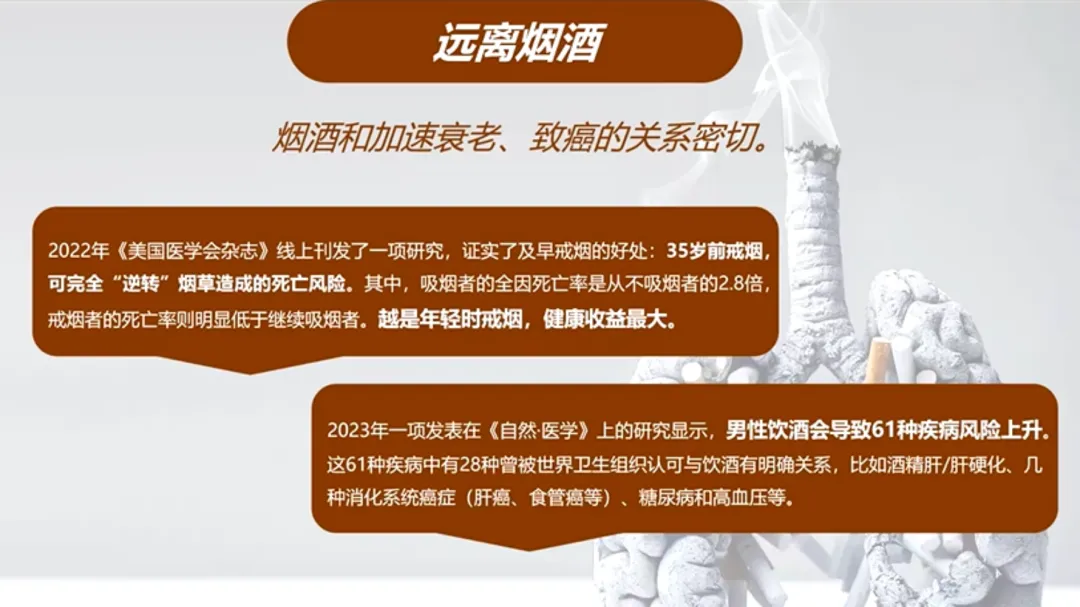 4、戒烟限酒: 35岁前戒烟,可以完全逆转烟草带来的死亡风险。而酒精,哪怕是一点点,也会增加包括癌症在内的多种疾病风险。