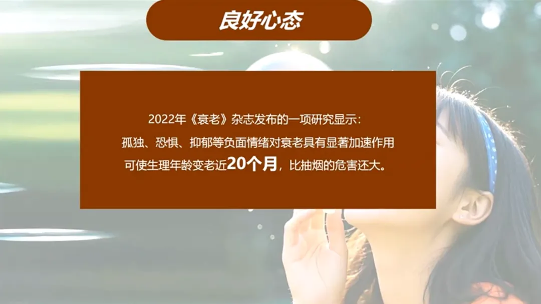 5、良好心态: 2022年《衰老杂志》研究指出,负面情绪会让生理年龄衰老近20个月,比吸烟的危害还大!学会管理情绪,减少压力,就是最好的细胞减负。