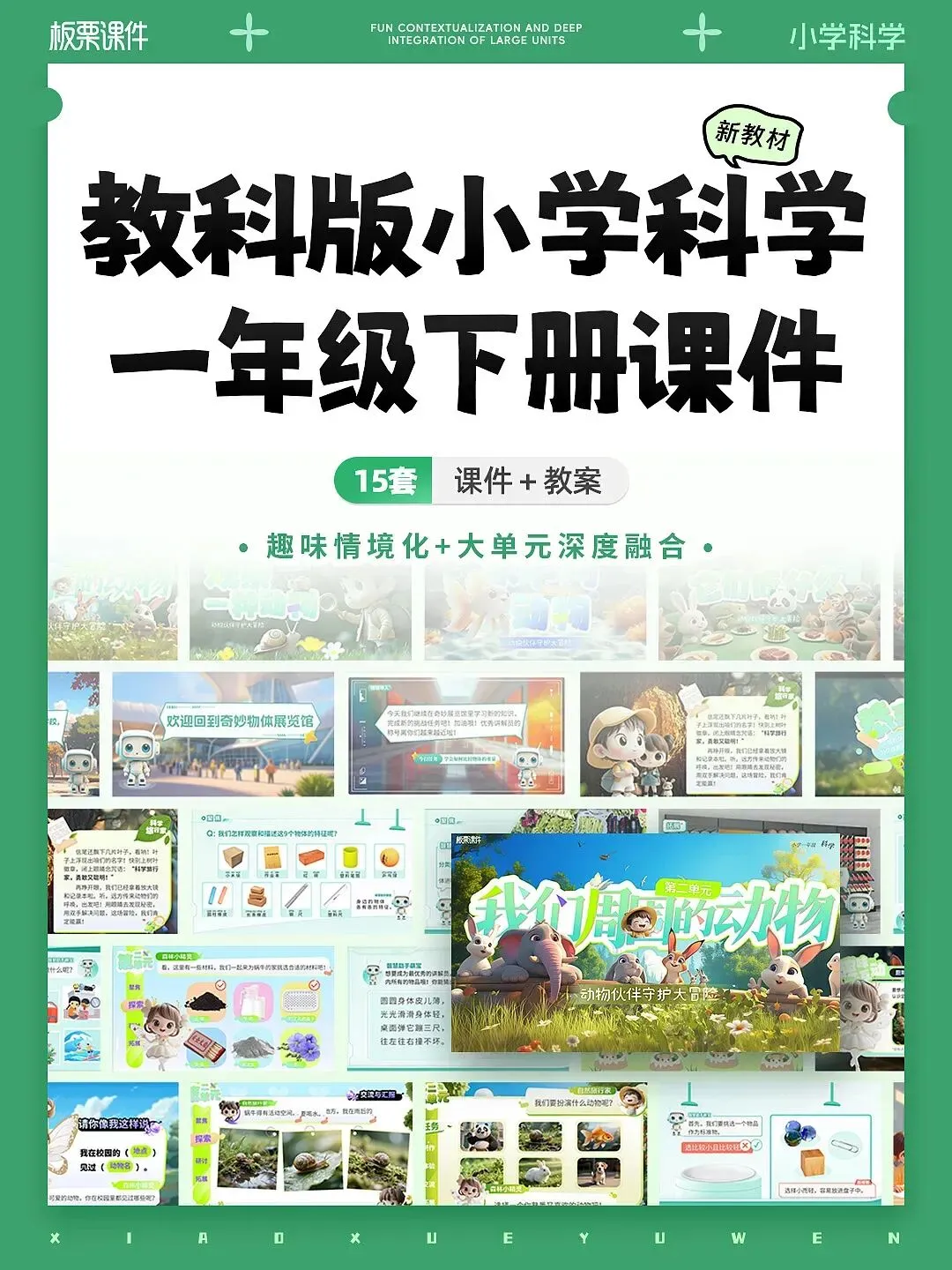 这是一套教科版小学科学一年级下册课件,共15套,配套教案与视频素材。它以大单元情境贯穿课堂,通过趣味互动、科学实验和生活化任务激发学生兴趣,还设置当堂检验巩固知识,专业美观的设计让备课更高效,非常适合新手老师和任务繁重的教师使用。