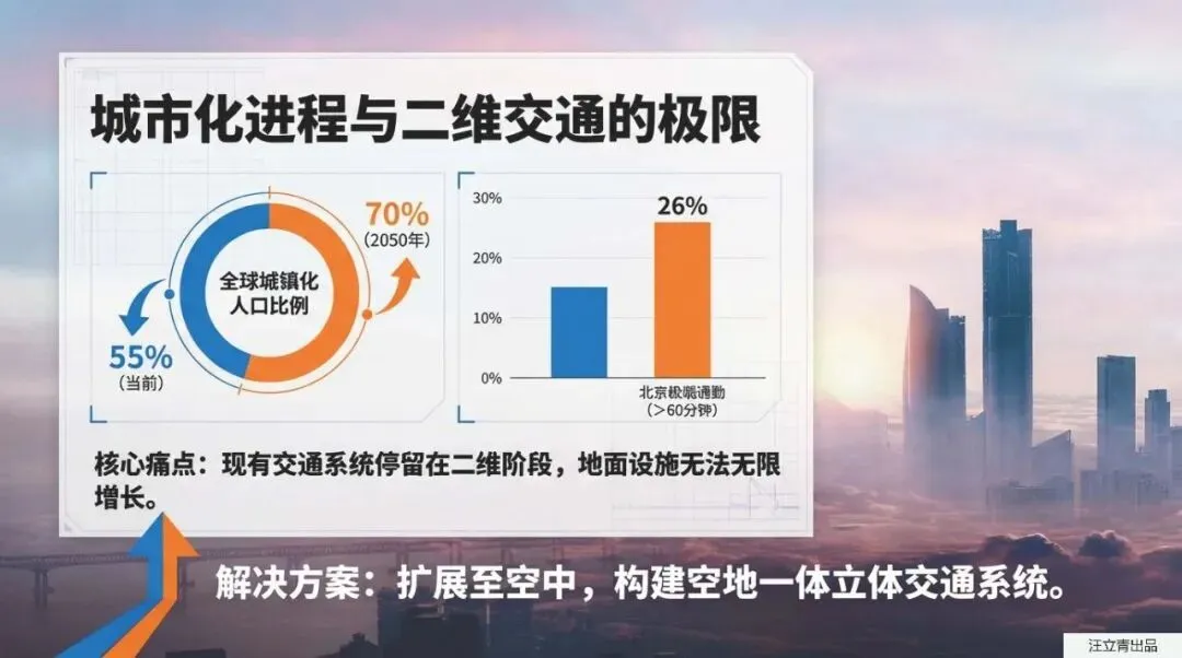 每天早上挤地铁、堵在环路上的你,是不是无数次幻想过能给车插上翅膀,直接从车流头顶上飞过去?数据显示,在咱们国家的主要城市里,有超过千万的打工人每天要忍受60分钟以上的极端通勤,像北京这种超级大城市,极端通勤的比例更是高达26%。其实,地面的马路修得再宽,也终究受限于二维平面的天花板,根本无法从根源上消灭拥堵。为了打破这个死结,科学家们决定直接“向天空要空间”,把出行的维度拓展到三维立体的高空!未来,低空智能交通系统将成为咱们出行的绝对主角,而“飞行汽车”也将经历从无人机送货、有人驾驶飞行,到最终完全无人驾驶的三个科幻般的进化阶段。