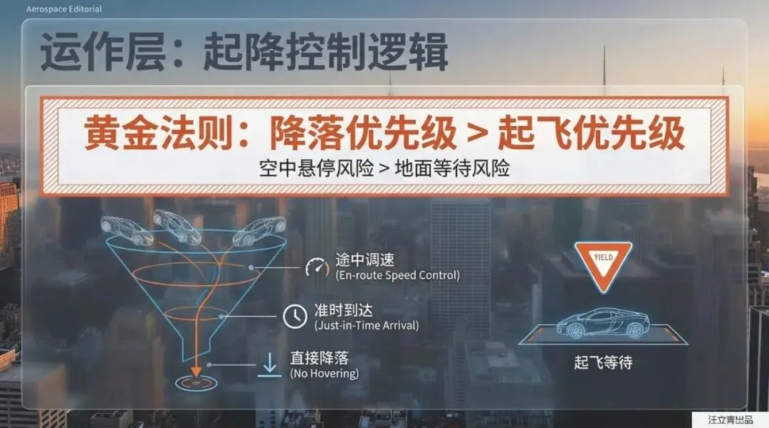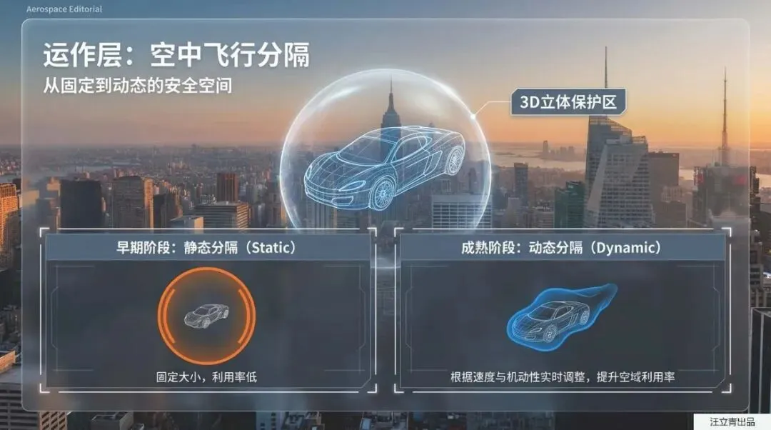 除了怎么飞,大家最关心的肯定还是安全问题:天上那么多飞行汽车,万一撞了怎么办?别担心,这套系统有着堪称“天眼”的操作级防撞黑科技!在空中的路口,飞行汽车根本不需要像在地面一样傻傻地踩刹车等红灯,因为空中大量悬停是非常危险的。相反,它们会利用超强的传感器和通信技术,提前预判冲突,然后聪明地自动加速、减速或者微调飞行高度,完美地擦肩而过。同时,每辆飞行汽车周围都会自带一个无形的“3D安全保护罩”,在初期车少的时候是个固定的圆球范围,等未来满天都是车了,系统还会根据你的车速和机动性动态调整这个保护罩的大小。更人性化的是,在起降管理上,系统永远秉持“降落优先”的原则,绝不让需要在半空悬停等待降落的车吃亏,最大程度保障所有人的安全。