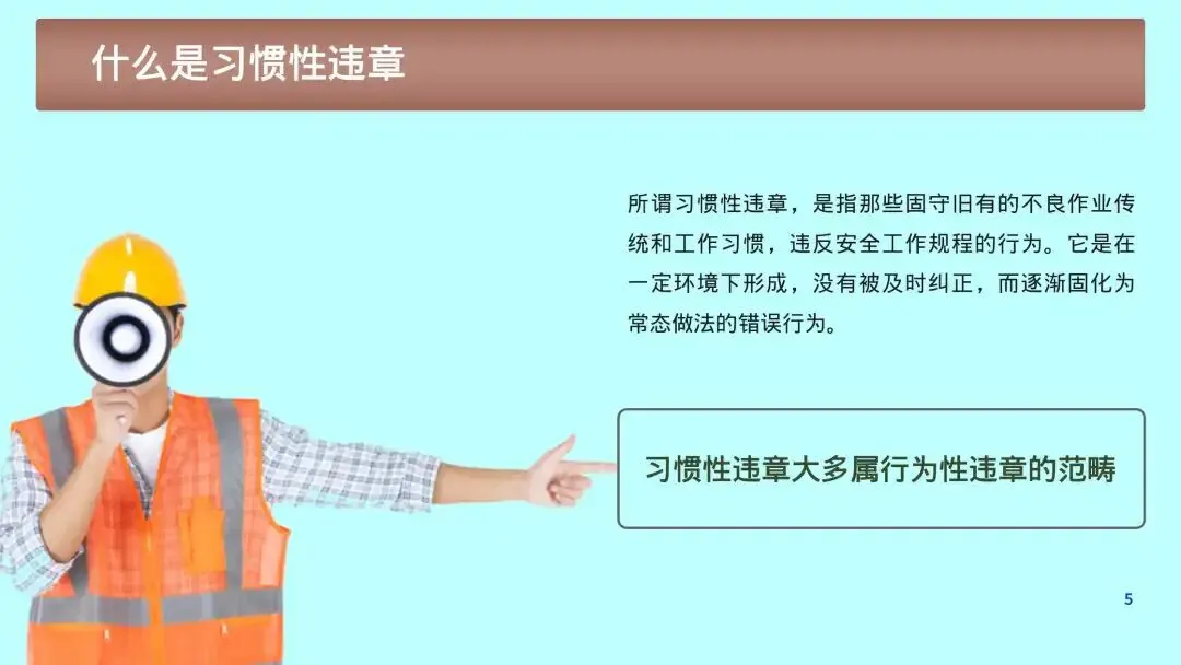 习惯性违章,是指员工在长期生产作业中,因侥幸心理、经验主义、图省事、从众心理等,逐渐固化下来、反复出现、习以为常的违反安全操作规程、安全管理制度、作业许可流程、劳动防护规定的行为模式。
