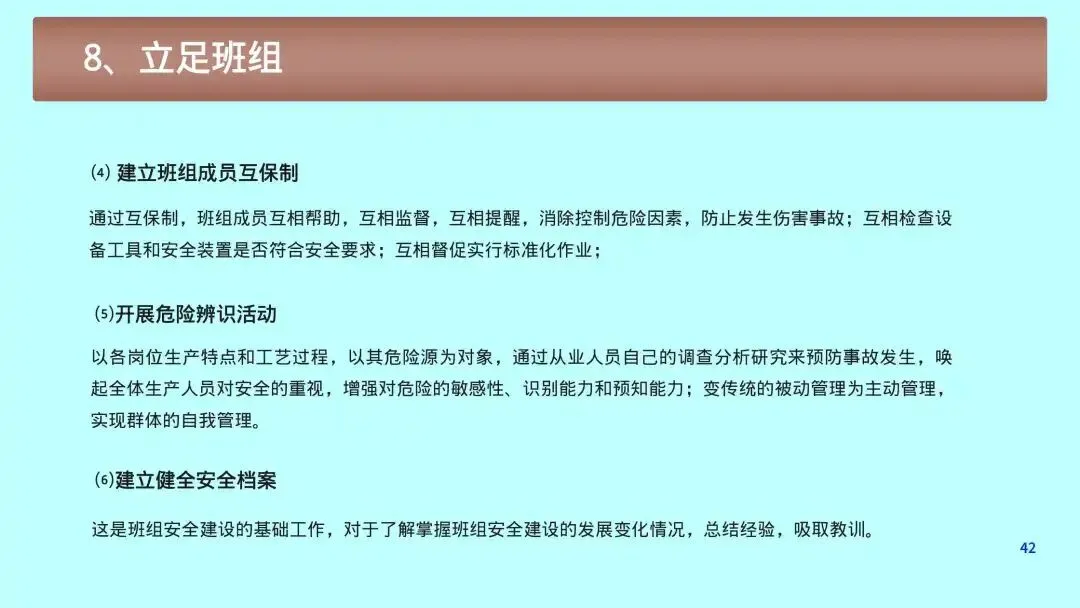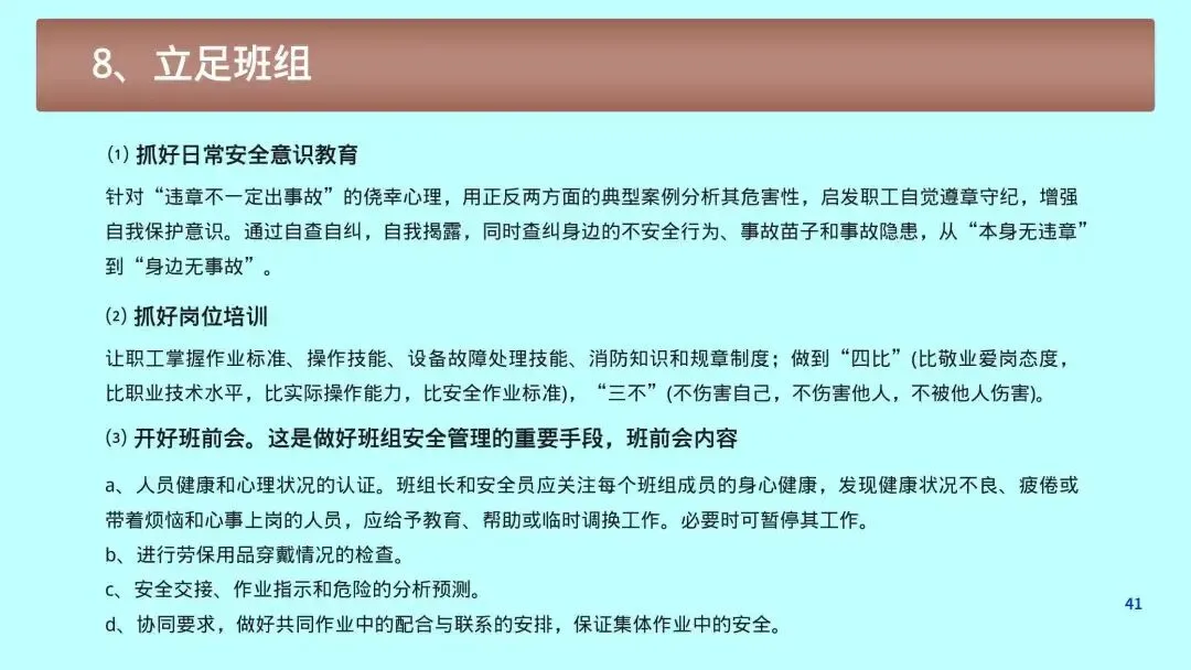1. 班前会5分钟安全:讲风险、讲规程、讲案例、讲提醒,做到每日安全唤醒。