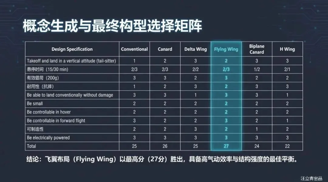 在航空航天领域,工程师们始终面临着一个经典的“鱼与熊掌”难题:我们想要直升机的垂直起降能力(VTOL),以便在狭窄空间如丛林、甲板或城市屋顶自由起落;同时,我们又渴望固定翼飞机的高速巡航效率和长续航能力。为了融合这两者,人类发明了像V-22“鱼鹰”那样复杂的倾转旋翼机,但机械结构的极度复杂性一直是其软肋。然而,这份来自杨百翰大学的研究报告通过详尽的工程实践,向我们展示了另一种更为优雅且极简的解决方案——“尾座式”(Tail-Sitter)无人机。这种飞机在地面时像火箭一样垂直“坐”在尾部,起飞时直冲云霄,升空后则平转机身像普通飞机一样水平飞行。该项目的核心目标极具挑战性:设计并制造出当时世界上最小的、能携带有效载荷(200克)的实用型尾座式无人机,且最大尺寸不超过1米。为了从众多构型中找到最优解,研究团队利用加权矩阵对比了常规布局、鸭式布局、三角翼等多种方案,最终锁定了“飞翼布局”(Flying Wing)。飞翼设计的优势在于它去掉了繁重的机身和尾翼结构,拥有极高的气动效率,这对于每一克重量都锱铢必较的垂直起降飞行器来说,是至关重要的物理基础。