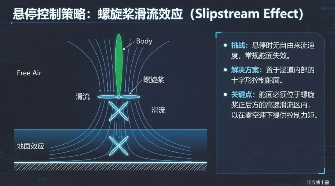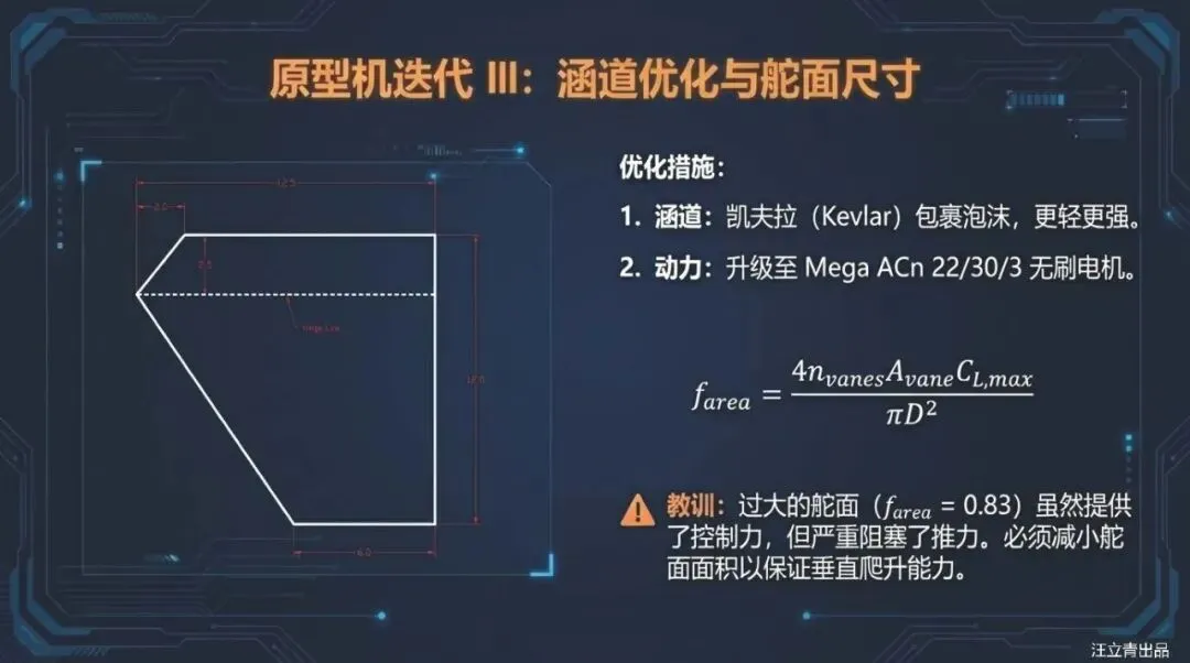 真正让这架飞机“起死回生”的关键突破,在于对控制系统与动力气动学的深度重构。在第三代和最终的第四代原型机中,研究人员引入了名为“Aither”的数值分析软件,将螺旋桨滑流理论与升力线理论结合,精准预测了螺旋桨后方的复杂流场。基于此,团队设计了一个独特的“涵道+控制叶片”系统。不同于普通飞机靠机翼上的副翼控制,尾座式飞机在悬停时没有迎面气流,必须依靠螺旋桨产生的强劲滑流吹过舵面来产生控制力矩。研究发现,如果舵面距离螺旋桨太远,气流会衰减;如果太近,又会产生物理干涉。最终,设计团队在螺旋桨后方安置了一个复合材料制成的涵道,并在其中植入了“十字形”布局的四个控制叶片。这种设计不仅保护了螺旋桨,更重要的是,即便在飞机垂直下降(气流反向)或处于地面效应区时,涵道内的叶片依然能提供足够的滚转、俯仰和偏航控制力。为了进一步减重,机身主体采用了EPP(发泡聚丙烯)材料配合双向纤维胶带覆盖,这种“软硬结合”的结构不仅将结构重量占比控制在了37%左右,还赋予了飞机惊人的耐撞性——即便在测试中发生坠落,它也能像泡沫玩具一样毫发无损。