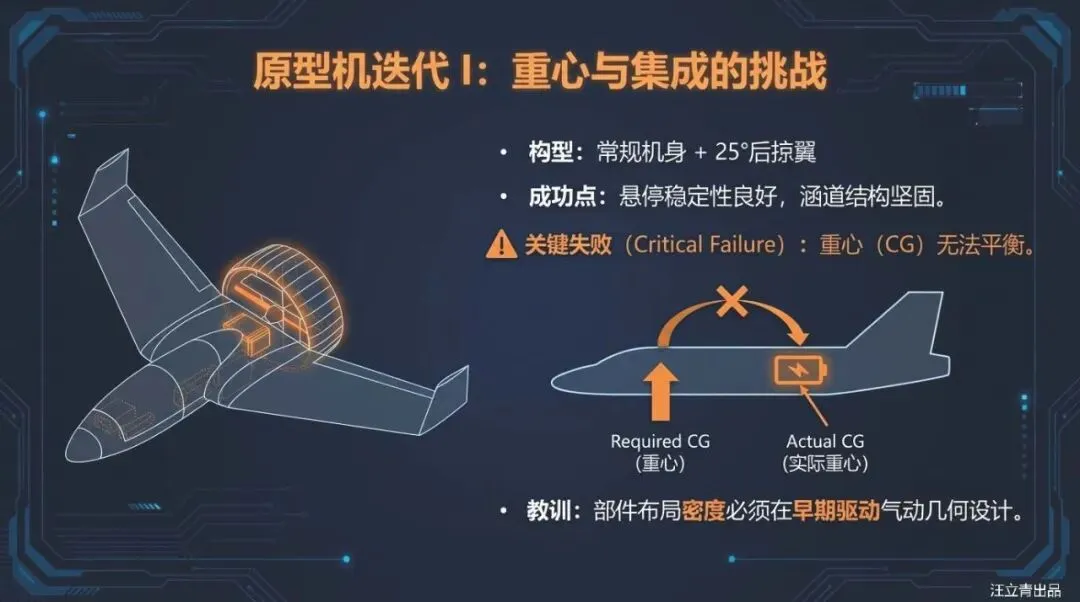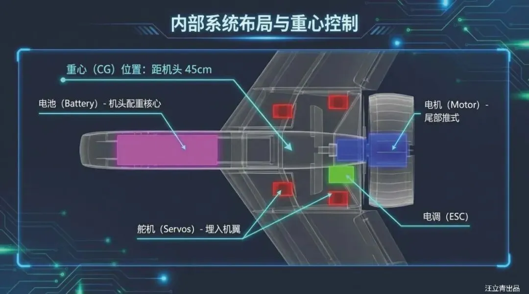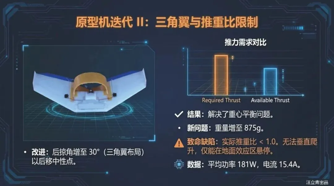然而,从理论到现实的跨越充满了工程陷阱,这架微型飞机的诞生经历了一场残酷的“进化论”式迭代。设计团队首先面临的是“推力匹配”与“平衡”的矛盾。垂直起降要求发动机推力必须大于飞机重力(推重比至少要达到1.3),但在水平巡航时,所需的推力却很小,这意味着大功率电机在巡航时效率极低。更棘手的是,飞翼布局虽然高效,但天生缺乏稳定性。在第一代原型机的测试中,虽然作为滑翔机它表现完美,但一旦安装了沉重的动力系统,重心(CG)的剧烈变化导致飞机根本无法配平,甚至出现了严重的俯仰失稳。到了第二代原型机,虽然解决了重心问题,却因为使用了大直径螺旋桨导致电子调速器(ESC)在封闭的泡沫机身内严重过热,甚至出现了“有心无力”的尴尬局面——飞机在地面效应区能勉强悬停,但推力不足以支撑其飞出地效区进入高空。这些失败深刻揭示了微型VTOL设计的残酷性:在极小的尺寸限制下,结构重量、电池能量密度与气动效率之间存在着极其脆弱的平衡,任何微小的设计冗余都可能导致任务失败。