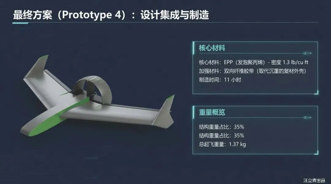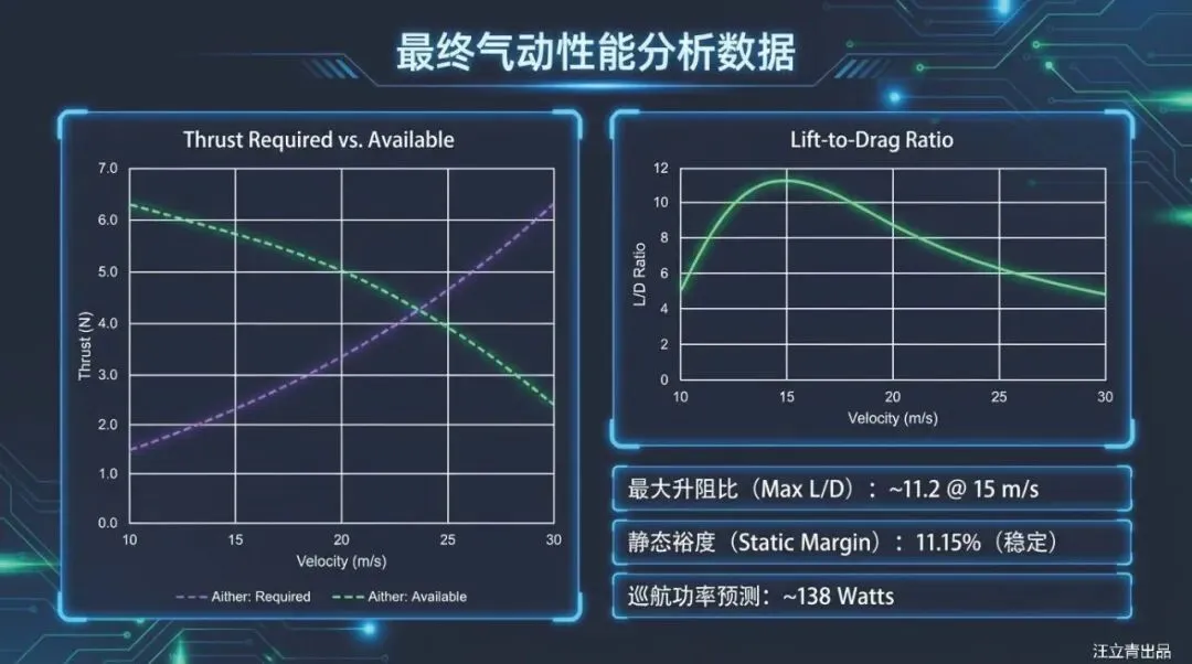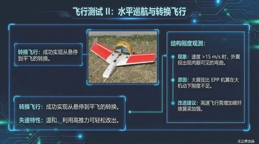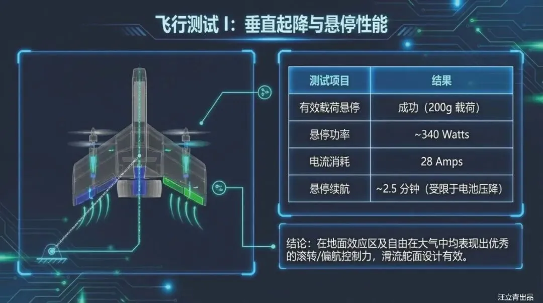最终诞生的第四代原型机,是一架集工程智慧于一身的杰作。它翼展1米,重约1.37公斤,搭载了大功率无刷电机和锂聚合物电池,成功实现了在携带200克载荷下的垂直起飞、空中悬停以及向水平飞行的过渡。飞行测试数据令人振奋:它在水平飞行时的升阻比达到了11.2,这意味着它拥有优异的滑翔效率;而在垂直模式下,它展现出了优秀的操控响应,证明了在没有复杂倾转机构的情况下,仅靠软件算法和气动布局的优化,完全可以驯服“尾座式”飞机不稳定的天性。这项研究不仅打破了微型无人机在起降场地上的限制,更为未来物流配送、城市监控等领域提供了一种低成本、高效率的新思路。报告最后更具前瞻性地指出,如果未来能引入同轴反转螺旋桨消除扭矩,或采用推力矢量技术,这种微型空中机器人的性能还将迎来质的飞跃。这不仅是一次技术的胜利,更是对“简单即是美”这一工程哲学的完美诠释。