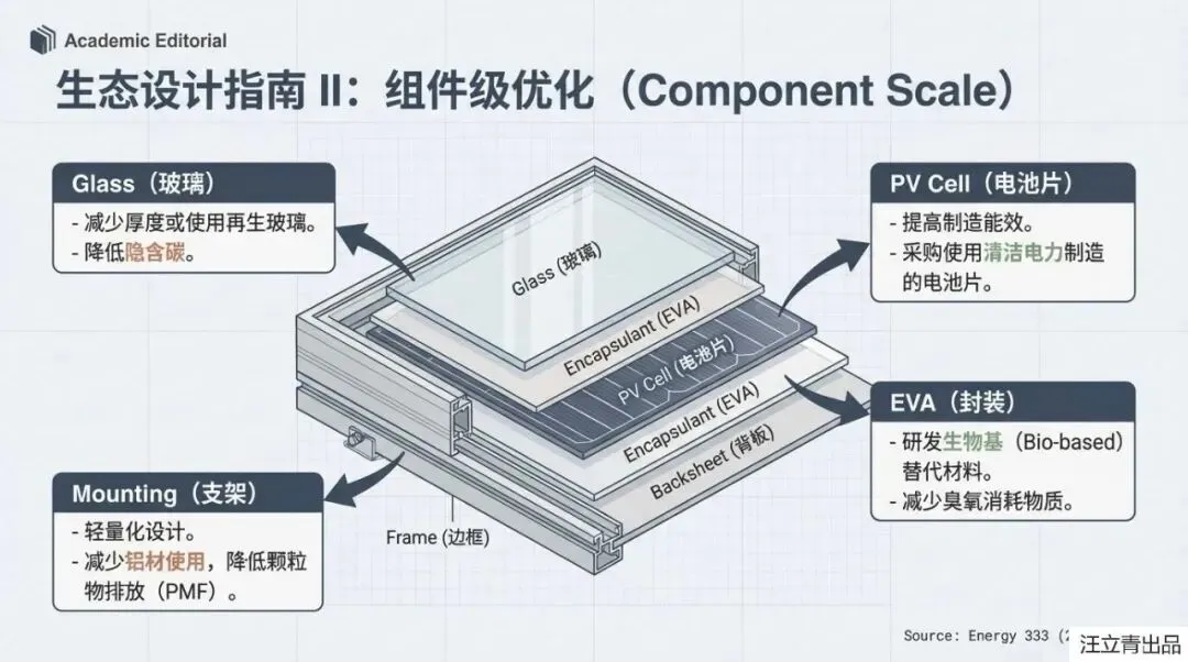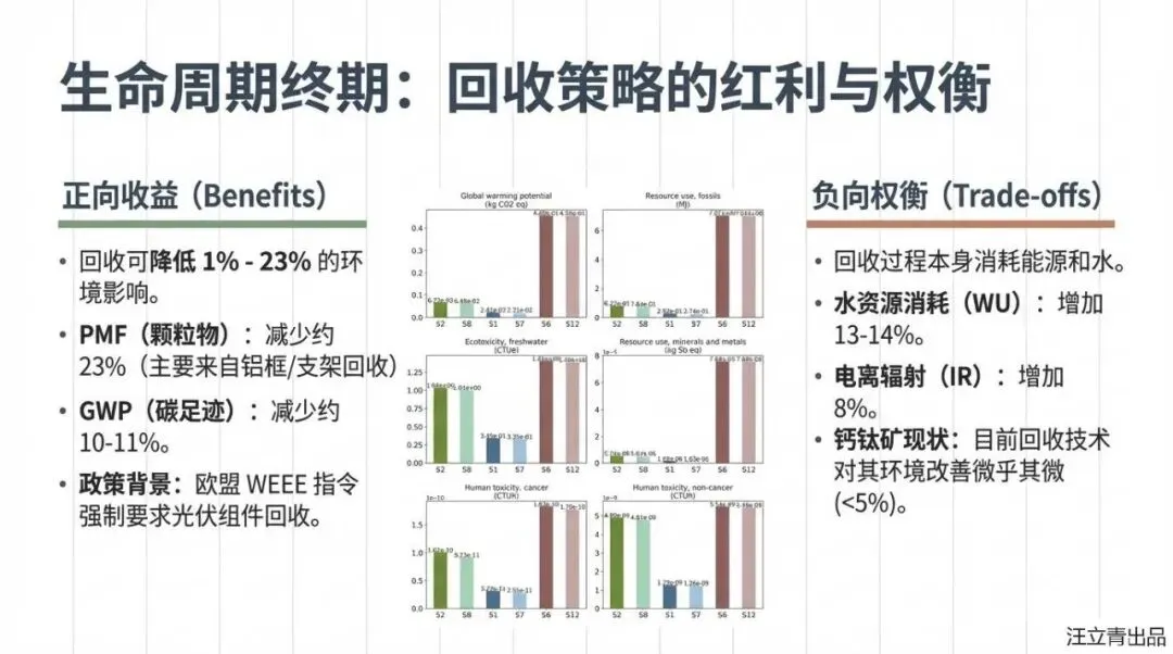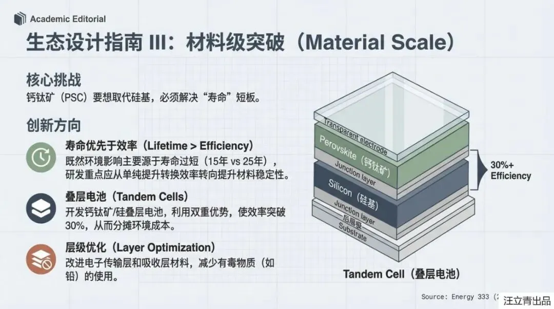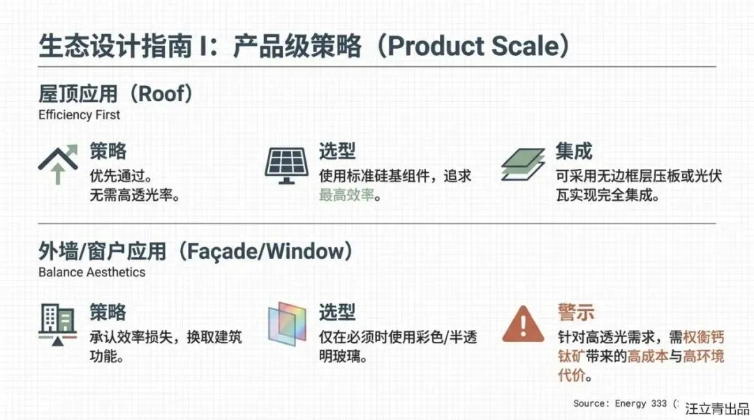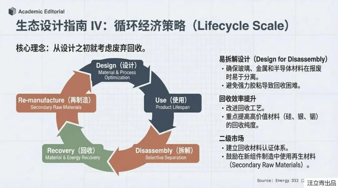 不过别担心,科学家们已经为这位“脆皮天才”开出了“生态设计”的药方,旨在2030年前后让它脱胎换骨。核心思路非常明确:首先要给钙钛矿“延年益寿”,通过改进材料结构来提高它的稳定性和效率,让它能像硅电池一样抗造。其次,报告强调了“循环经济”的重要性,强制性的回收机制不仅能处理掉电池中可能含有的重金属(如铅)等毒性隐忧,还能回收玻璃、铝和铜等高价值材料,将环境影响降低20%以上。未来的BIPV设计将更加“看人下菜碟”:屋顶应用继续发挥硅电池的高效长寿优势,而窗户和幕墙则留给不断进化的、更美观的钙钛矿技术。
