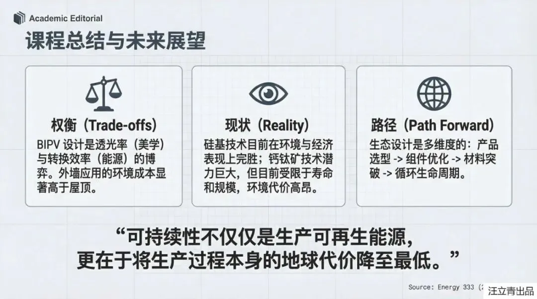 这场能源革命的最终目标,是实现全球的脱碳愿景和净零排放。虽然钙钛矿现在还处于“刷经验”的阶段,但它与硅电池并非死对头,如果将两者结合做成“叠层电池”,效率甚至有望突破30%的理论天花板。随着技术的成熟和生产规模的扩大,这些集发电、隔热、美观于一体的智能组件,将让我们的城市从能源消耗者转变为绿色能源的贡献者。虽然挑战不少,但正如报告所言,通过全生命周期的科学设计,我们完全有理由期待一个随处可以发电、既环保又省钱的低碳新时代。