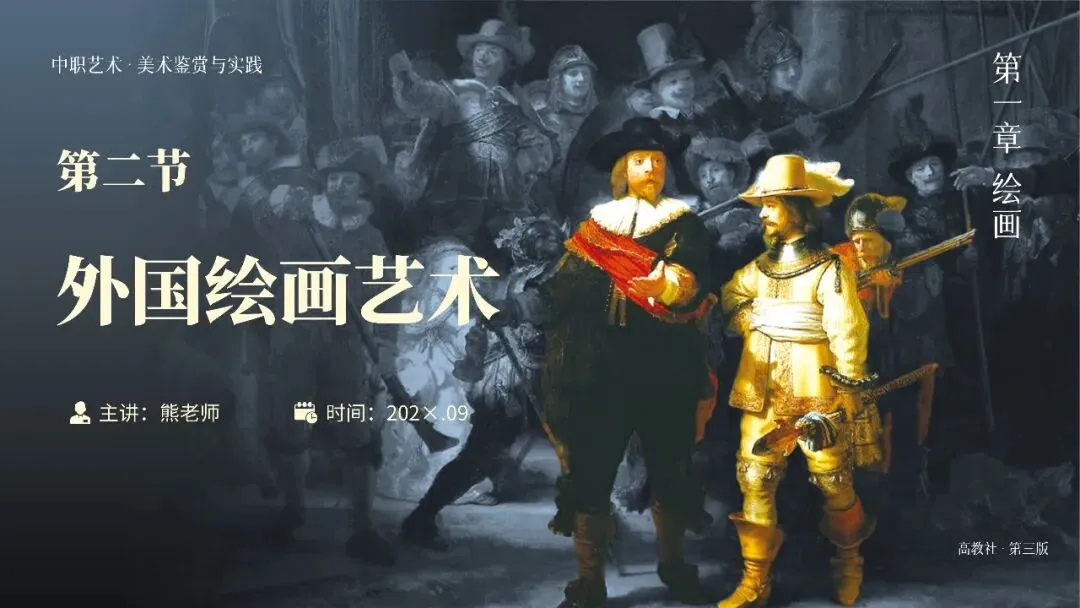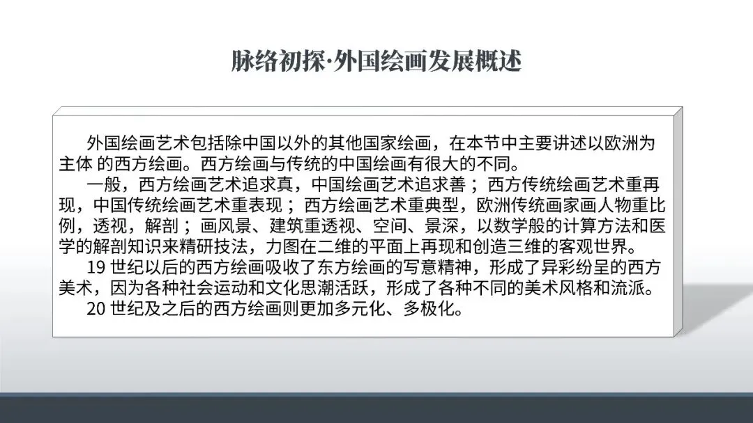 本期更新的课件为统编高教社版中职《艺术(美术鉴赏与实践)》第一章 第二节:外国绘画艺术,共39页。