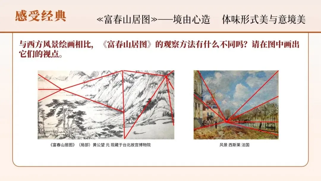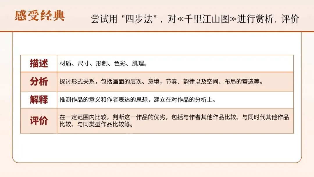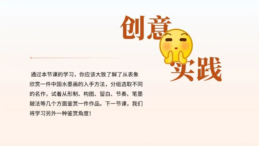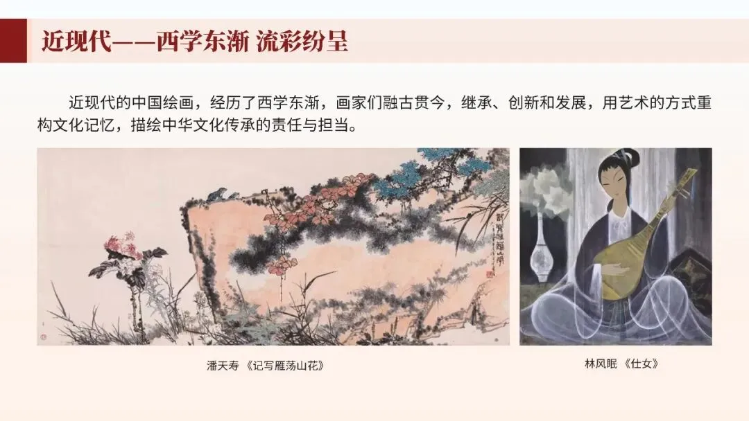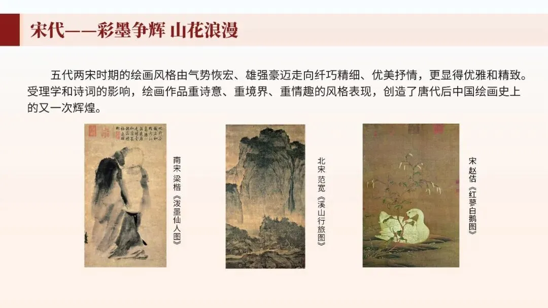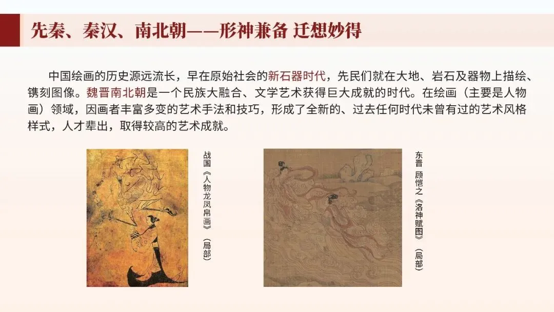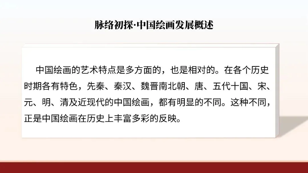 本节系统梳理中国绘画发展脉络,赏析山水、花鸟、人物画经典名作。重点理解中国画"以形写神""意境营造"的审美特征,掌握笔墨技法、构图章法等表现要素,体会书画同源的文化内涵,提升对传统视觉艺术的鉴赏能力。