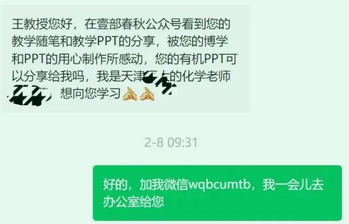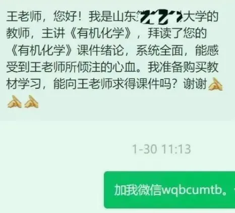 同学们终究要走出校门,到社会上去闯荡。情商高的人,与人沟通畅快,无疑得到的帮助和提携多一些,发展得也更快一些。 人与人之间的交往,说话(含留言)无疑是体现情商的一个重要方面,所谓“一句话惹人笑,一句话惹人跳”,也许是同样的意思,两种不同的语言表达,结果迥异。比如,有的同志要课件,私信留言就两个字“课件”,让人苦笑不得,就连最起码的尊重都看不到: 我们主编的《有机化学》教材及配套课件很受同行的喜爱,我们也很愿意与同行交流。但我们也想知道课件的相对准确的流向和希望得到大家在使用过程中的一些反馈,我想也无可厚非。有时对方私信索取课件,但询问对方的基本情况,或让对方加我微信好转发资料,却又如石沉大海,渺无音讯。很感慨人与人之间的信任如此之难。本教材的配套课件,用于同行之间的交流,也很希望能得到同行礼貌的认可和鼓励,更希望同行能积极反馈一些建议,有利于我们进一步完善这本书,打造经典的能源工科类有机化学教材。我们将继续对购买和使用我们教材的同行,在核实基本信息后提供课件。也希望同行多为我们公众号和教材的推广,点赞转发和推荐。附录1、【教学随笔】有机化学试题命制的几点体会(合集)