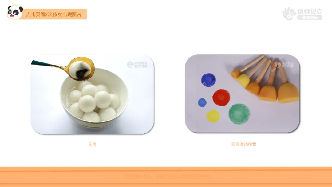 1.出示图片“元宵-外观”及“海绵印章”,引导幼儿了解表现元宵外形的方法。