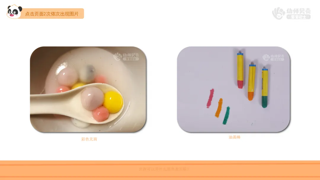 2.出示图片“元宵-外观”及“油画棒涂画”,引导幼儿了解表现元宵颜色的方法。