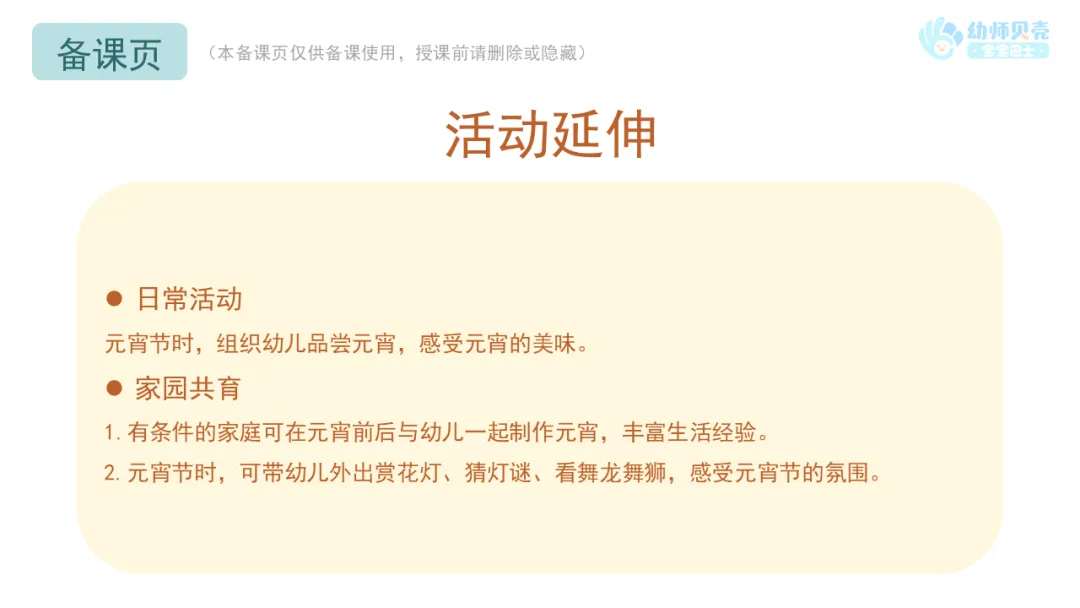 1.有条件的家庭可在元宵前后与幼儿一起制作元宵,丰富生活经验。
