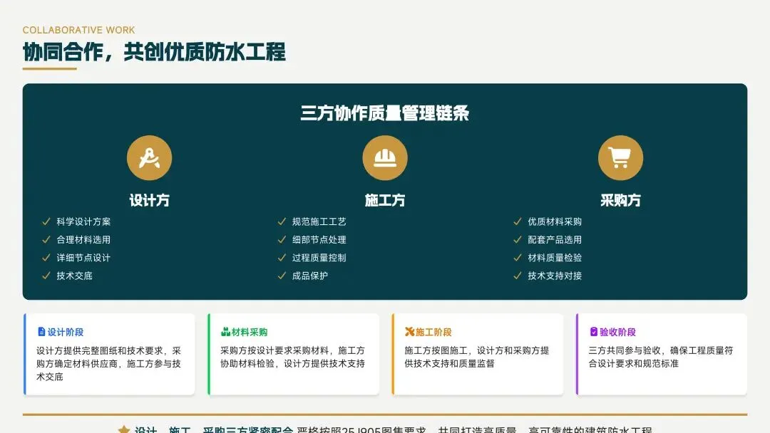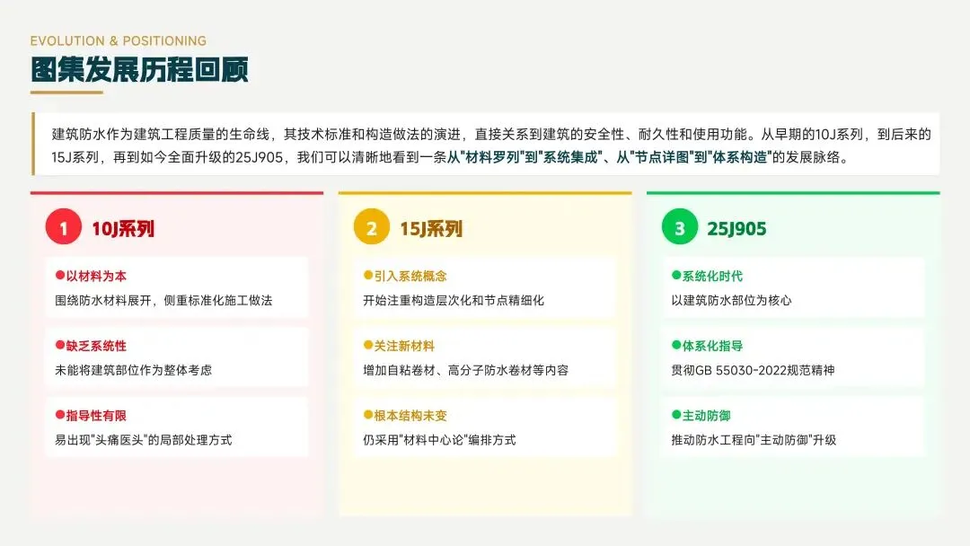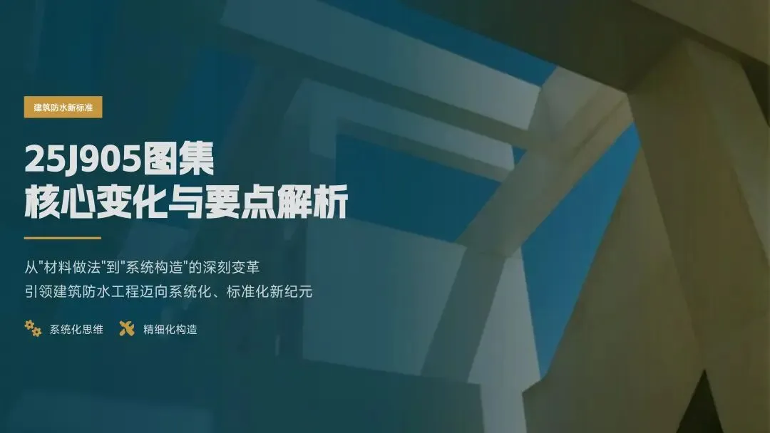 建筑防水图集从10J系列到25J905,经历了从“材料罗列”到“系统集成”、从“节点详图”到“体系构造”的发展,25J905引入系统概念,推动防水工程向“主动防御”升级。