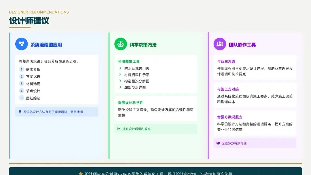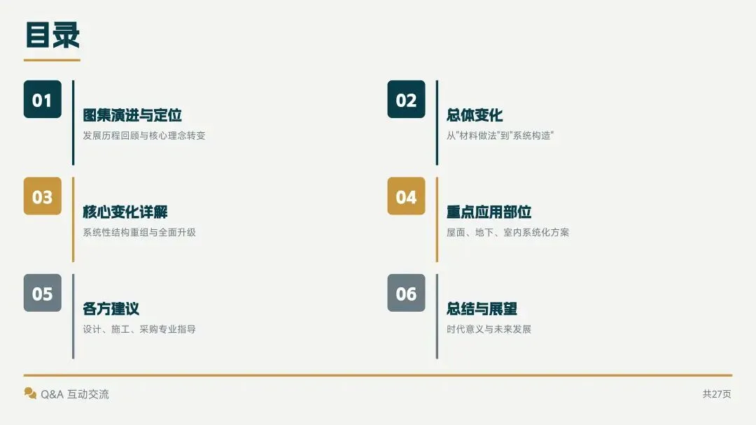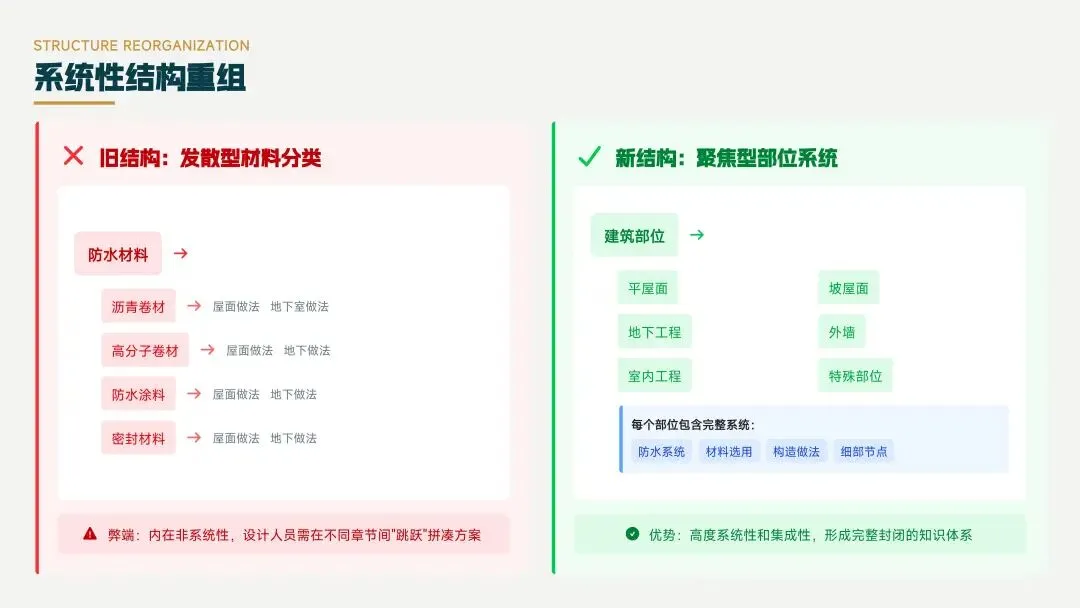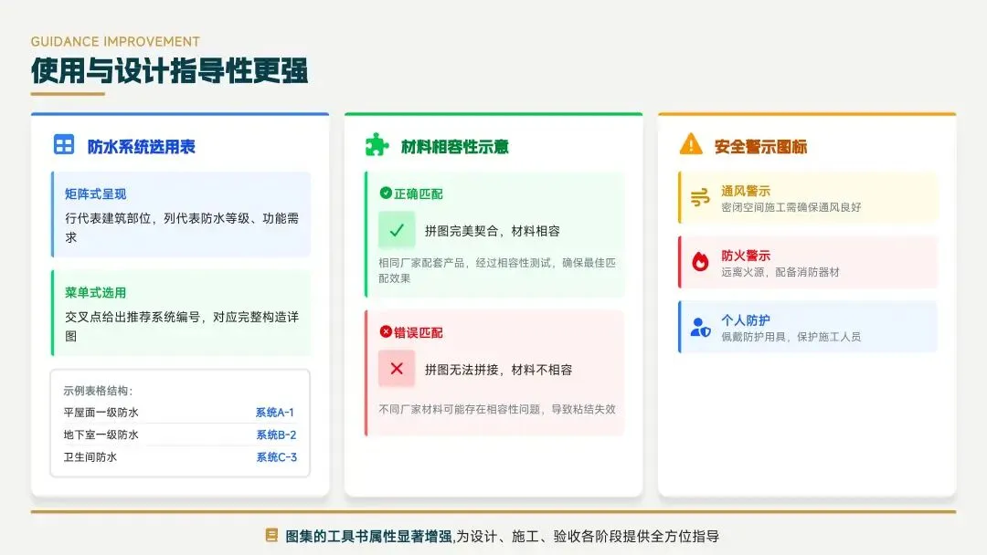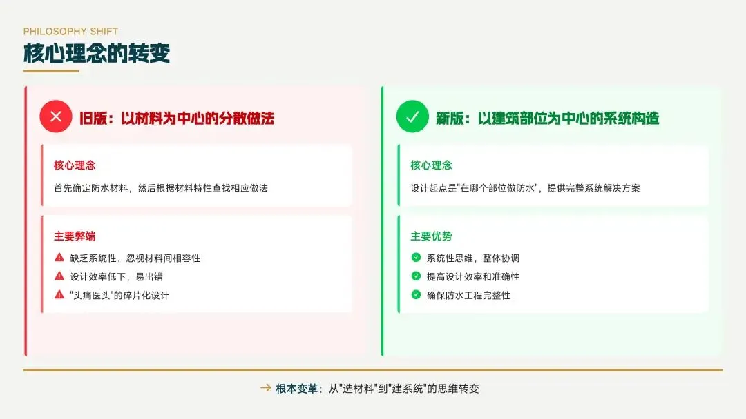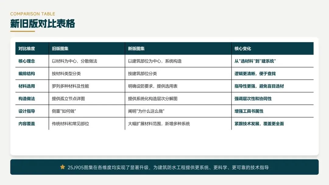 新版图集以建筑部位为中心,采用系统构造理念,转变了核心理念,提高了设计效率和准确性,确保防水工程完整性,实现了从“选材料”到“建系统”的思维转变。