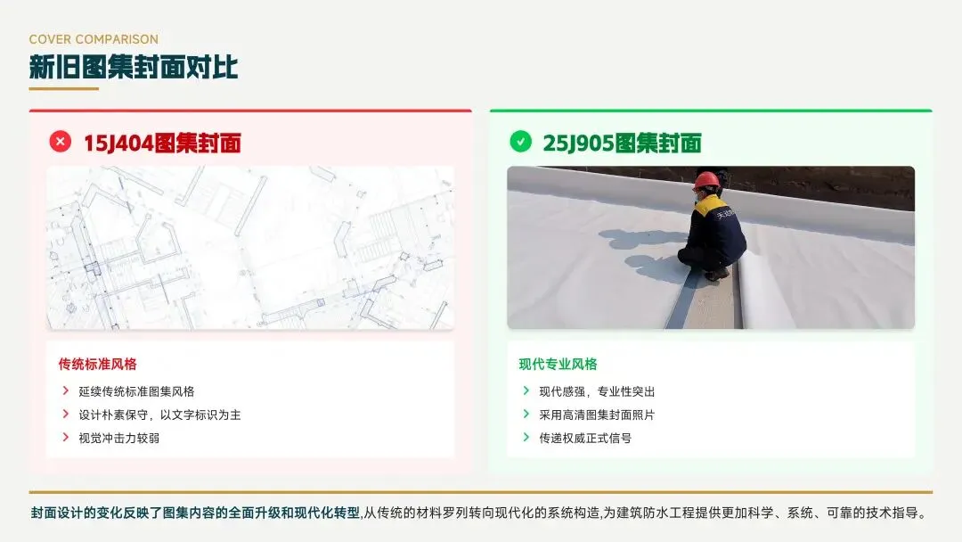 25J905封面采用现代专业风格,高清照片展示,与15J404的传统标准风格形成对比,体现了图集内容的全面升级和现代化转型,为建筑防水提供更科学、系统、可靠的技术指导。
