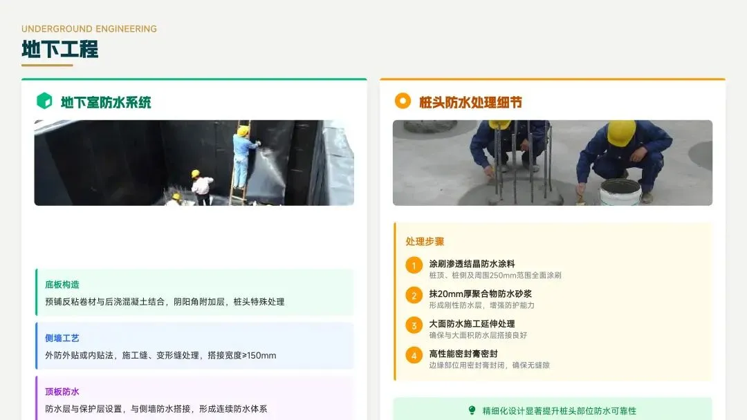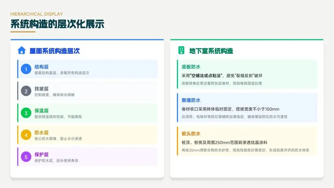 25J905图集层次化展示了地下室和屋面的系统构造,包括底板、侧墙、桩头等防水设计,以及屋面结构基层、找坡层、保温层等构造层次,确保防水工程的系统性和可靠性。