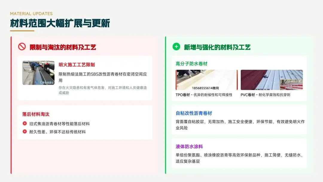 25J905图集限制和淘汰了落后材料及工艺,如热熔法施工的SBS卷材,新增和强化了高分子防水卷材等高效环保材料,提高了防水工程的性能和环保性。