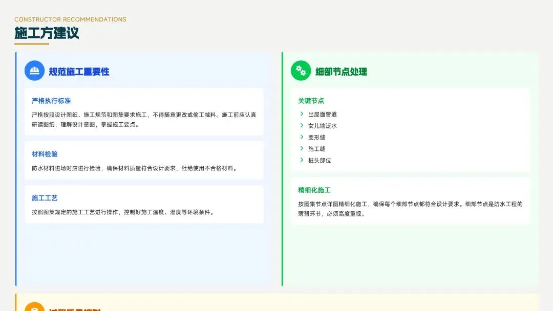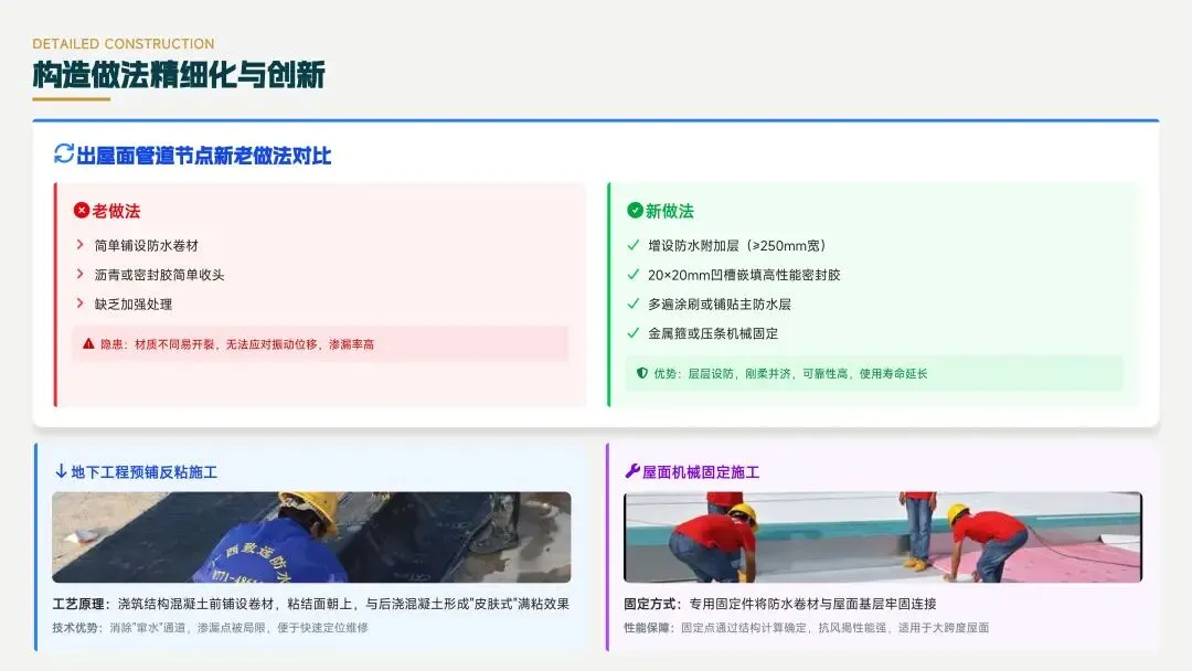 25J905图集在构造做法上进行了精细化与创新,如出屋面管道节点采用增设防水附加层等新做法,地下工程采用预铺反粘施工等新技术,提高了防水工程的可靠性和耐久性。