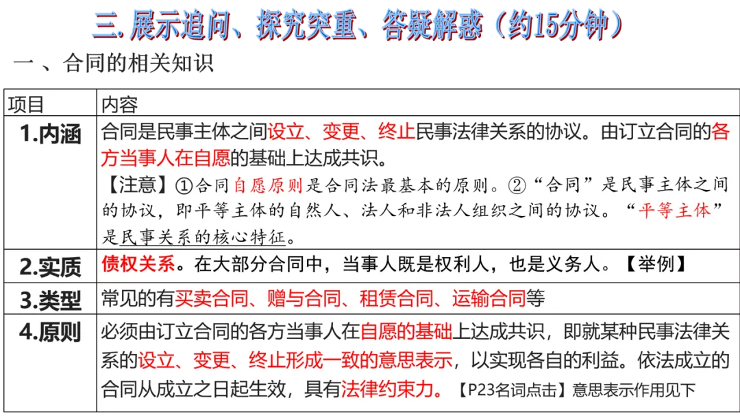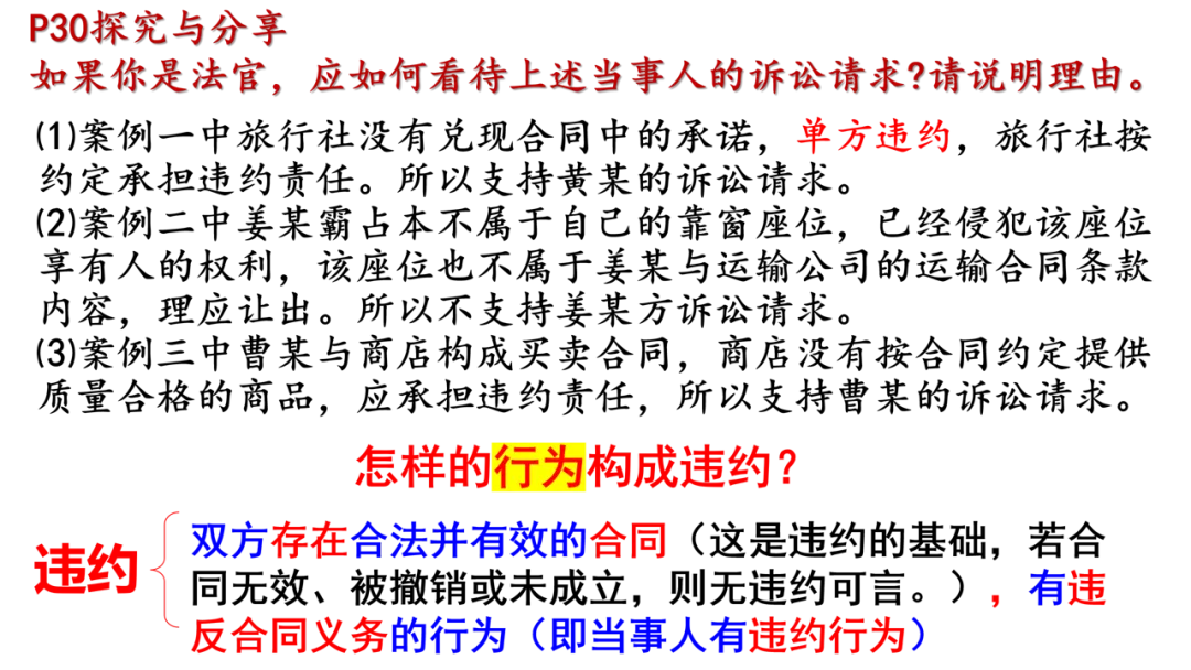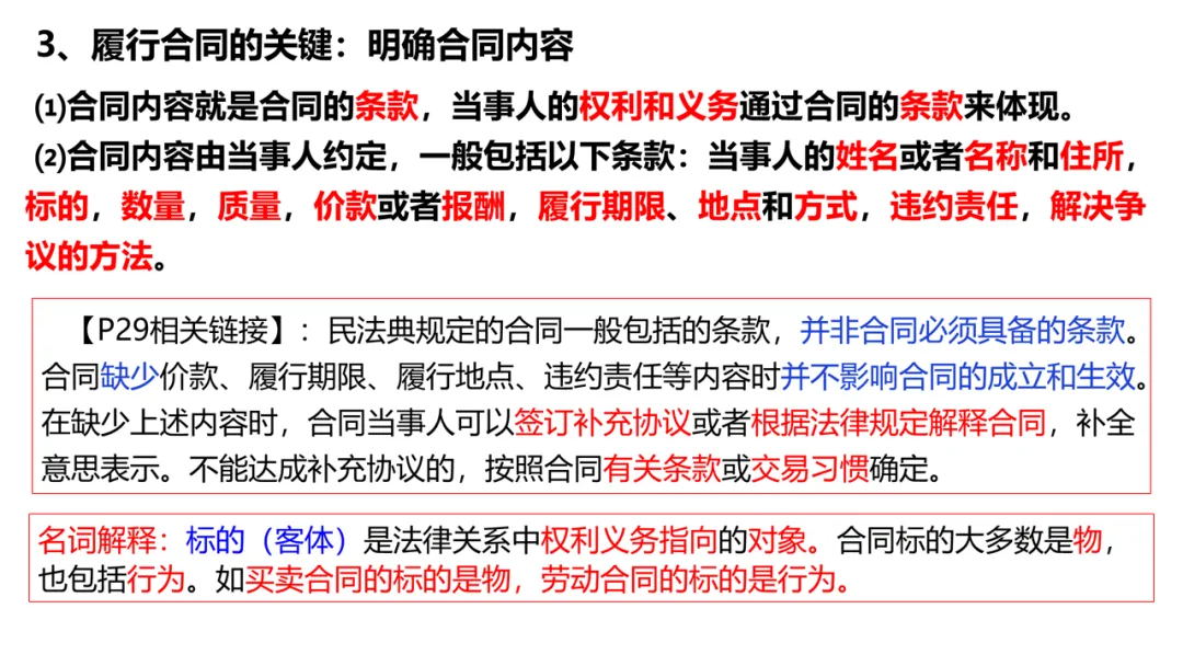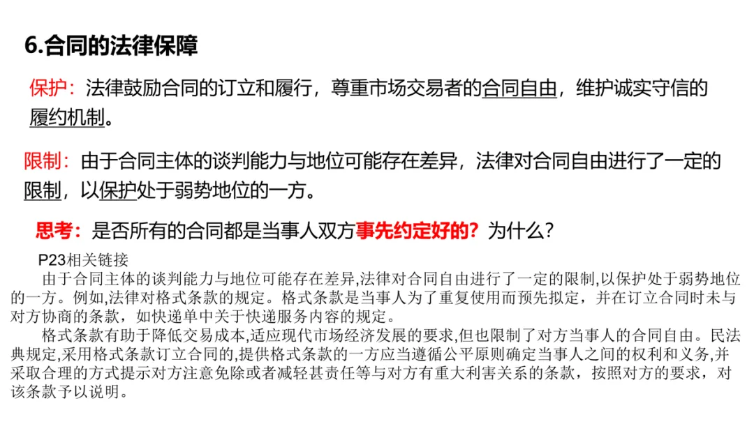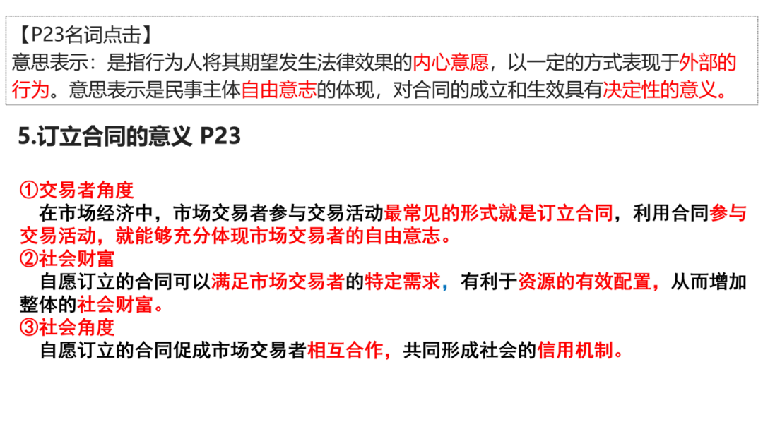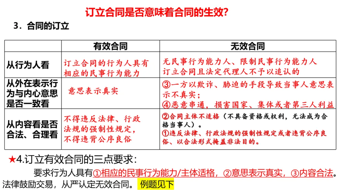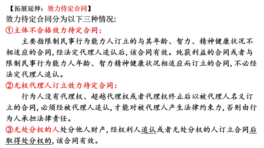 2024北京朝阳二模:订立合同并不当然意味着合同的生效。如果合同内容出现违反法律、行政法规的强制性规定或者违背公序良俗等情形,仍然可能导致合同全部或者部分无效。如果合同的主体不适格或者因欺诈、胁迫导致当事人意思表示不真实,也会使得合同存在瑕疵或者效力处于不确定状态。据此,下列推理合理的是( )①如果合同部分无效,那么它一定是违反了法律的强制性规定②一个完全有效的合同,必须是不违背社会公序良俗的合同③如果合同主体不适格,那么当事人的意思表示一定不真实④意思表示不真实的合同,不能产生当事人预期的法律约束力答案C。技巧①排②选,只有C【解析】①:如果合同部分无效,那么它一定是违反了法律的强制性规定或者违背公序良俗等情形,①错误。②:一个完全有效的合同,必须是不违背社会公序良俗的合同,②正确。③:如果合同主体不适格,不等于当事人的意思表示一定不真实,③错误。④:意思表示不真实的合同,也会使得合同存在瑕疵或者效力处于不确定状态,不能产生当事人预期的法律约束力,④正确。 见P25最后1段