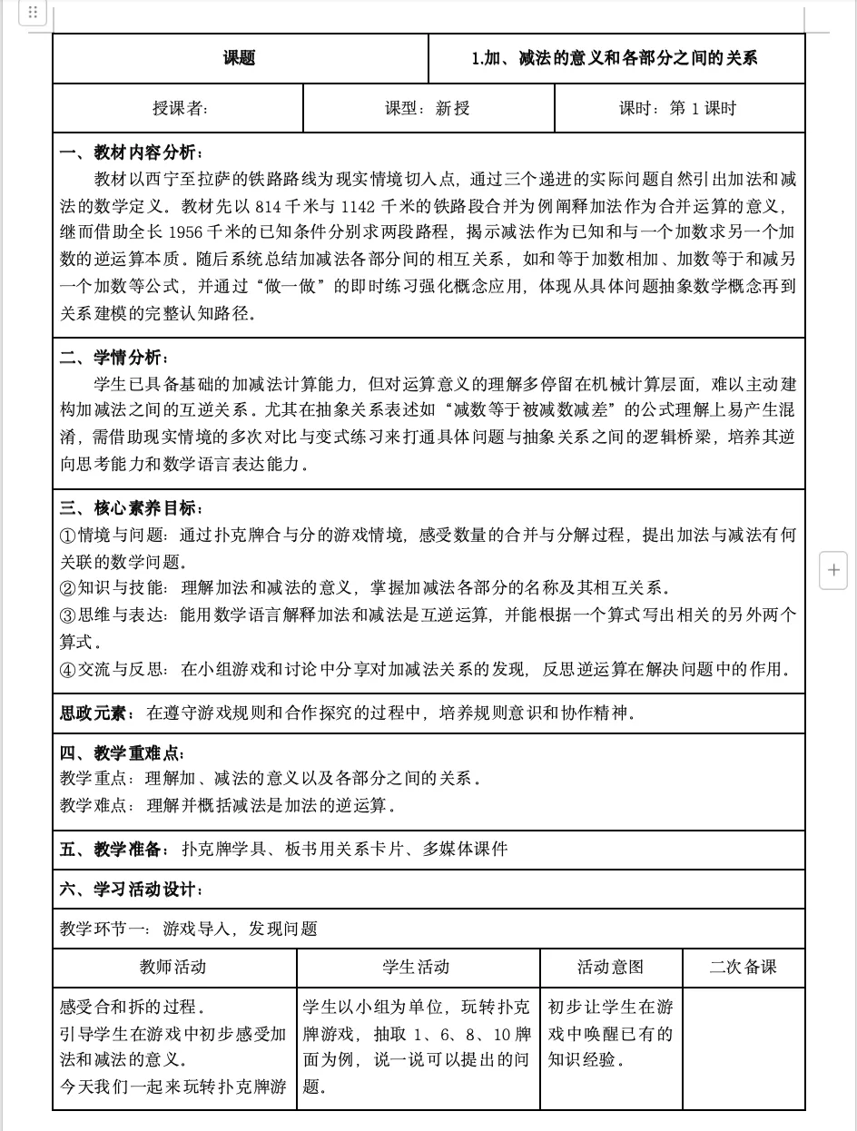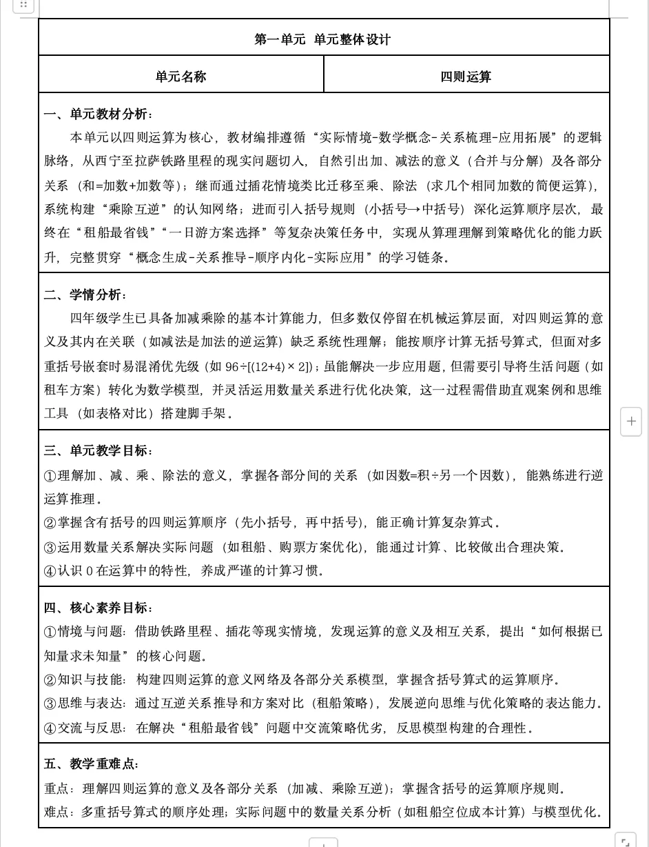 >【四年级】人教版数学四年级下册核心素养教案