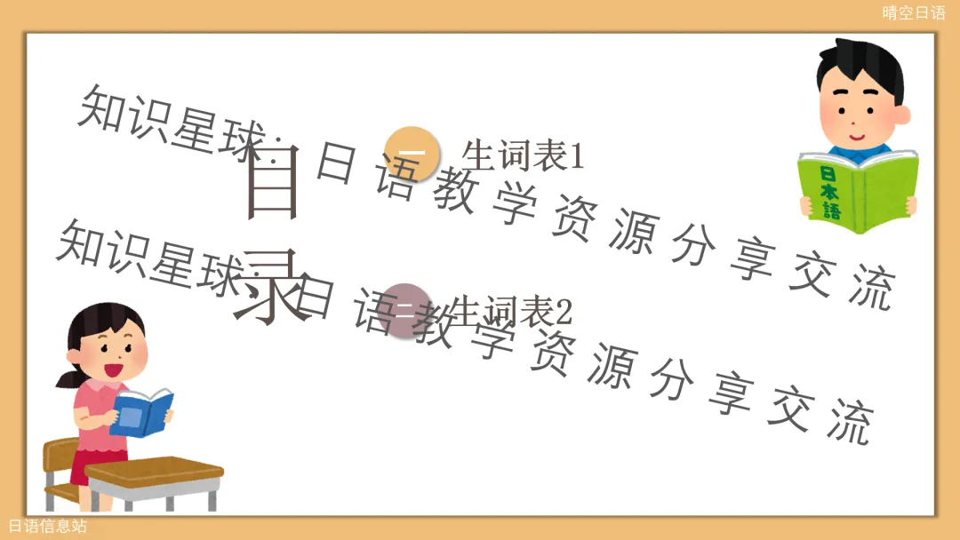 以上课件为新版人教版八年级第5课单词、语法课件,配套练习及思维导图也已制作完成。新版人教版八年级教材系列的单词和语法课件已经制作完成了一半,陆续会上传到知识星球:“日语教学资源分享交流”。这是其中一个版本,把一课的内容分为单词、语法、课文来讲解,单词分为生词表1和生词表2两个课件。后面还会上传另一个版本。另外,新版八年级相关的每一课配套练习、思维导图、单词默写等也上传了一些到到知识星球:“日语教学资源分享交流”。后面会持续把剩下的每一课配套课件、配套练习题、思维导图都上传到知识星球:“日语教学资源分享交流”。如有需要,可加入知识星球:“日语教学资源分享交流”下载。