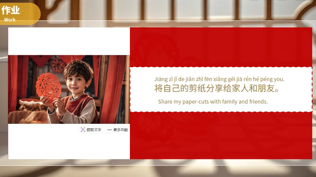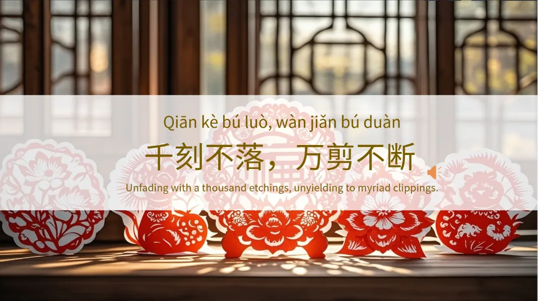 通过精美的图片展示,学生们可以直观地感受到剪纸艺术的美丽和精致,同时配以英文解释,帮助理解。