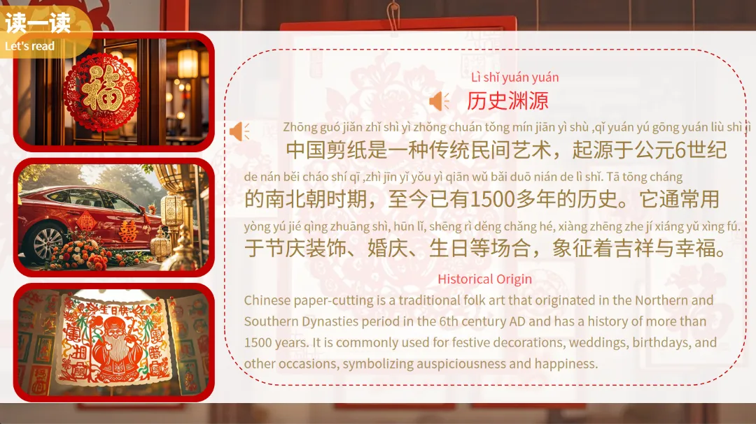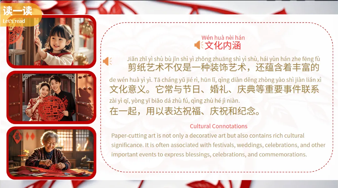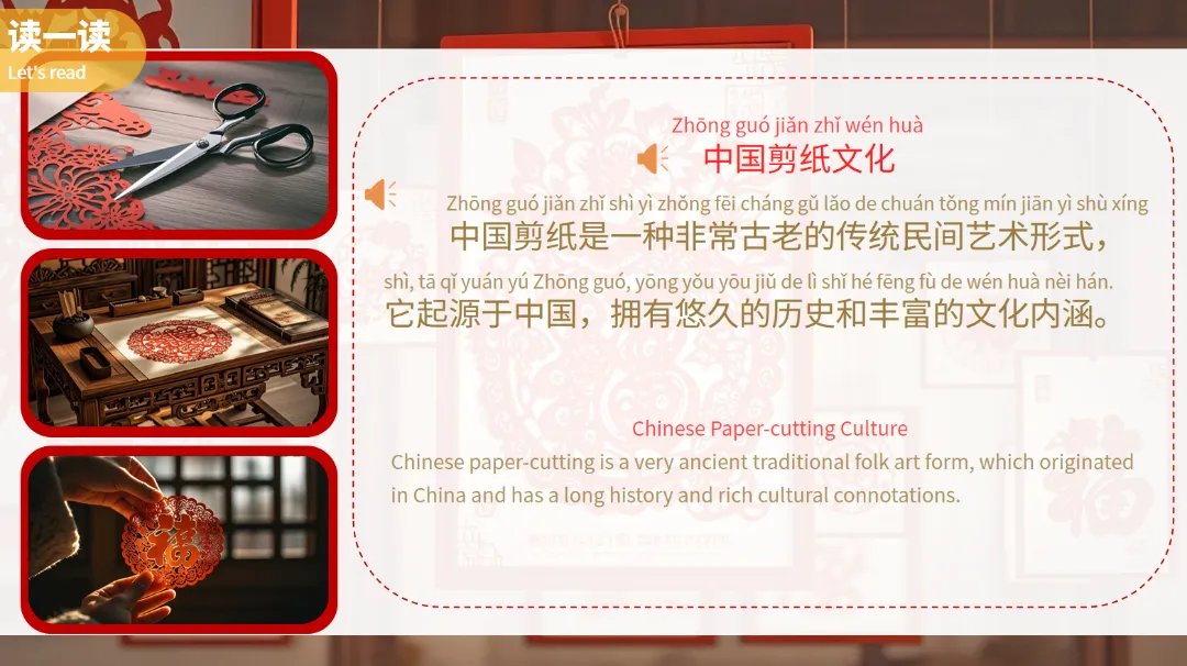 课件从“读一读”开始,用中英双语介绍了中国剪纸文化、历史渊源以及文化内涵,让学生们对剪纸有一个初步的认识。
