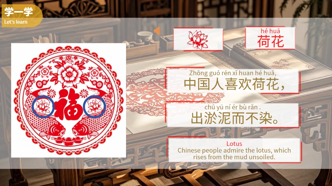 在“学一学”部分,课件详细讲解了剪纸中常见的元素,如荷花、花、动物、人物和文字等,并配以拼音和英文翻译,方便学生们学习。