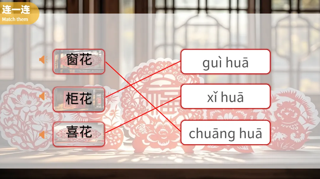 通过“连一连”,学生们需要将剪纸的名称与对应的图片连接起来,考验他们的记忆力和理解力。