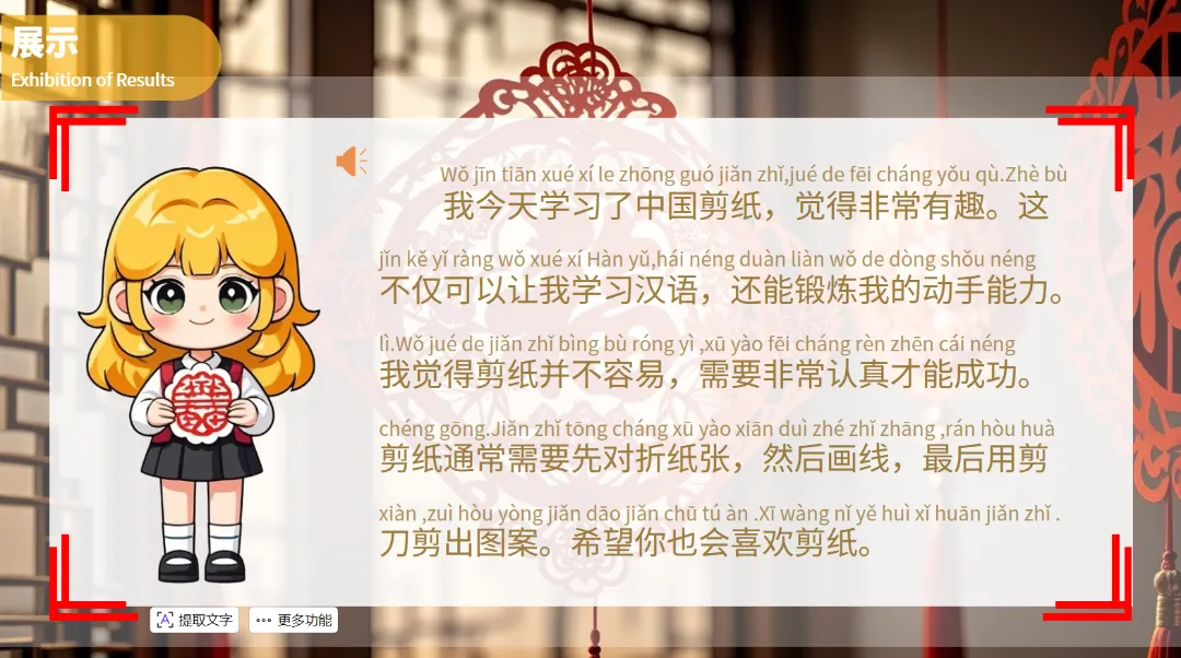 通过这一环节,学生们不仅可以学到与剪纸相关的汉语词汇,还能了解这些元素在中国文化中的象征意义。