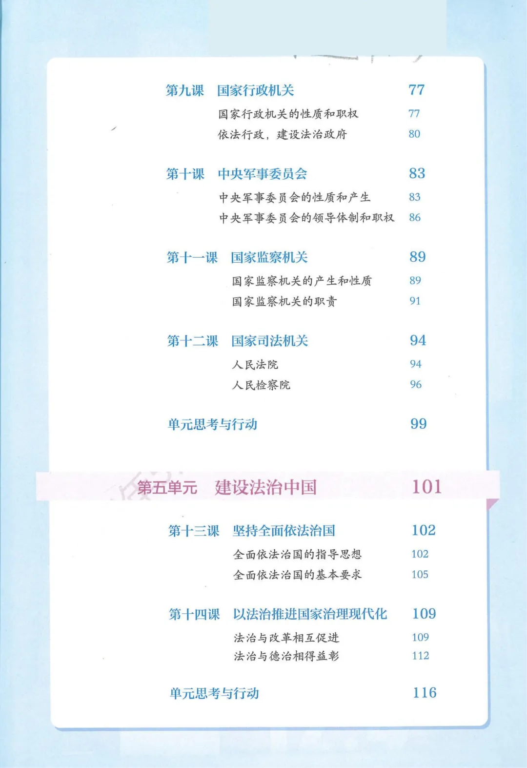 4.第四单元“走近国家机构”:系统讲解国家权力机关、国家主席、行政机关等各类国家机构的性质、职权及相互关系,让学生了解国家权力运行机制。