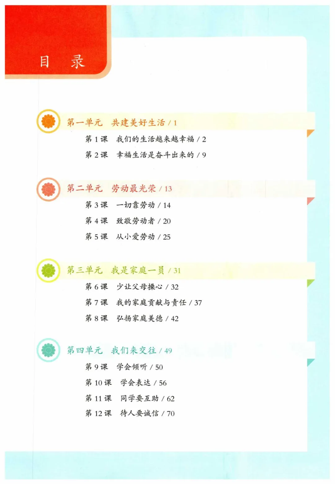 本册教材共设四个单元,12 节课,以 “立德树人” 为根本任务,围绕 “共建美好生活、劳动最光荣、我是家庭一员、我们来交往” 四大主题展开,各单元逻辑紧密、层层递进,贴合学生的生活轨迹和成长需求。