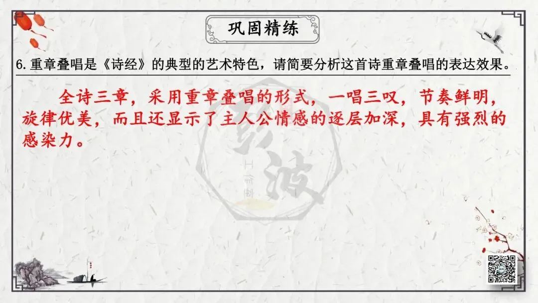 (1)叠词:叠词作用不外两种:增强语言的韵律感或是起强调作用。杨柳青青江水平,闻郎江上唱歌声。(《其一》刘禹锡)