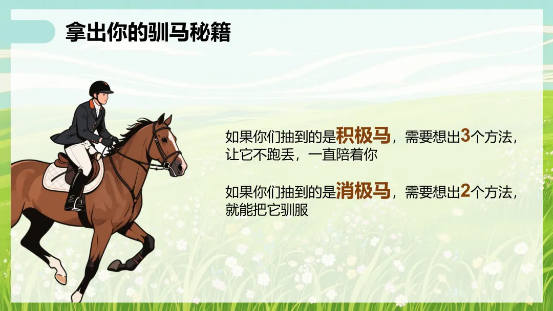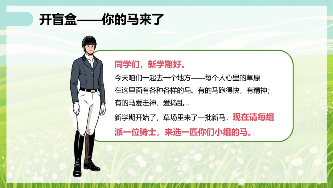 设计目的:用盲抽制造悬念,快速带入“心马骑士”的情境;确保每个小组有一匹专属的“马”,建立归属感和任务感。