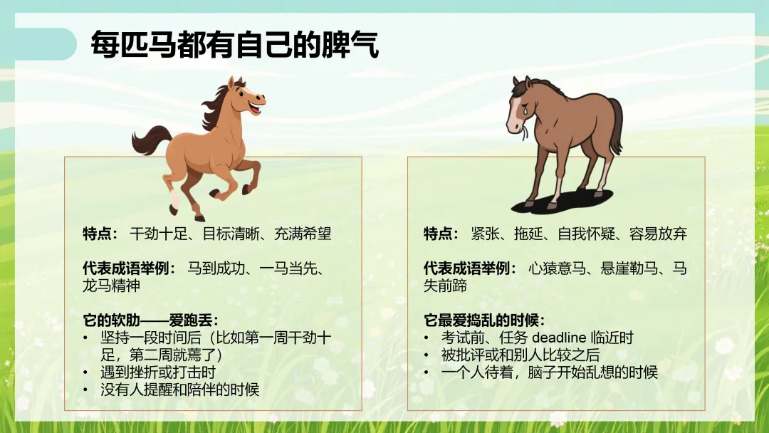 通过小组讨论,把抽象成语和自己的生活经验连接起来,发现每匹马的多面性;为后续“留住积极马、驯服消极马”做好认知铺垫